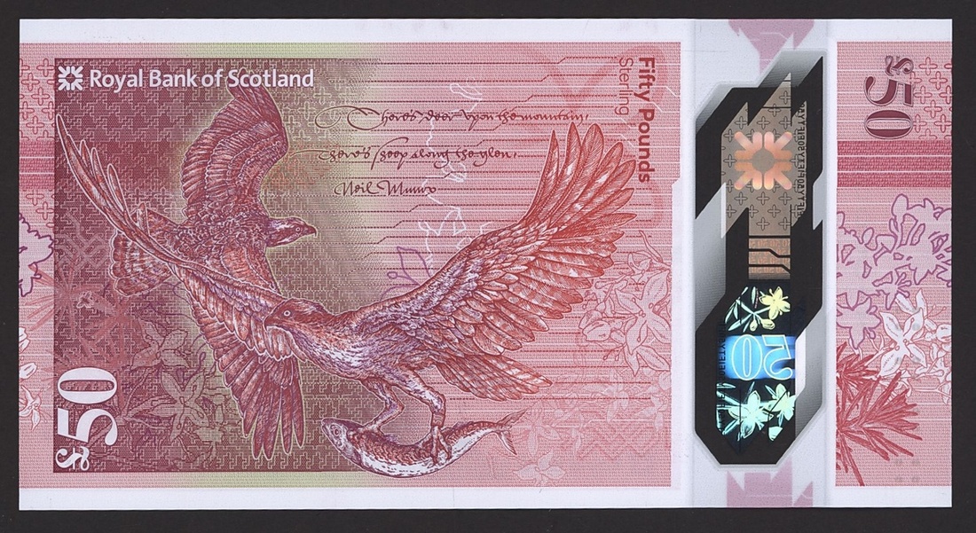 Royal Bank of Scotland plc, polymer £50, 27 May 2020, serial number AA000017, red and pink, the Scottish education campaigner and pioneer Flora Stevenson at right, Randolph Crescent in Edinburgh where Flora Stevenson lived at centre left, reverse pair of ospreys