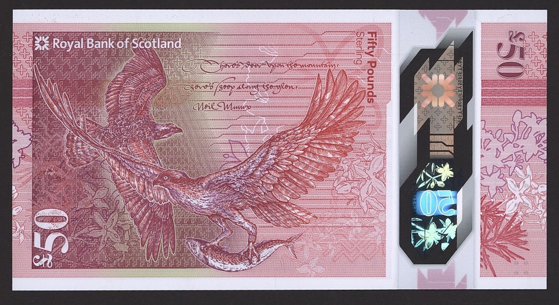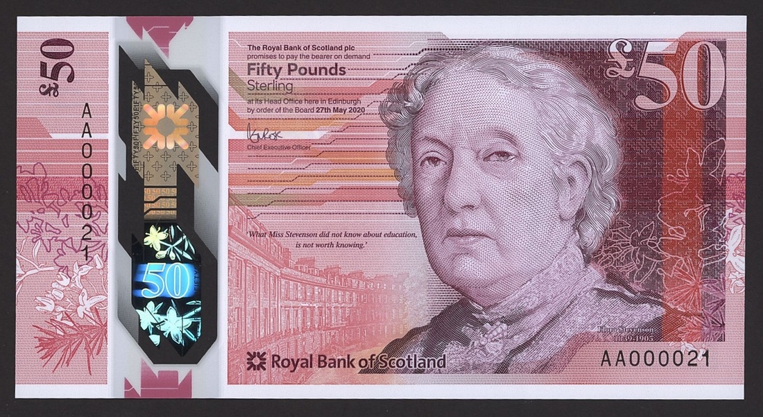 Royal Bank of Scotland plc, polymer £50, 27 May 2020, serial number AA000021, red and pink, the Scottish education campaigner and pioneer Flora Stevenson at right, Randolph Crescent in Edinburgh where Flora Stevenson lived at centre left, reverse pair of ospreys