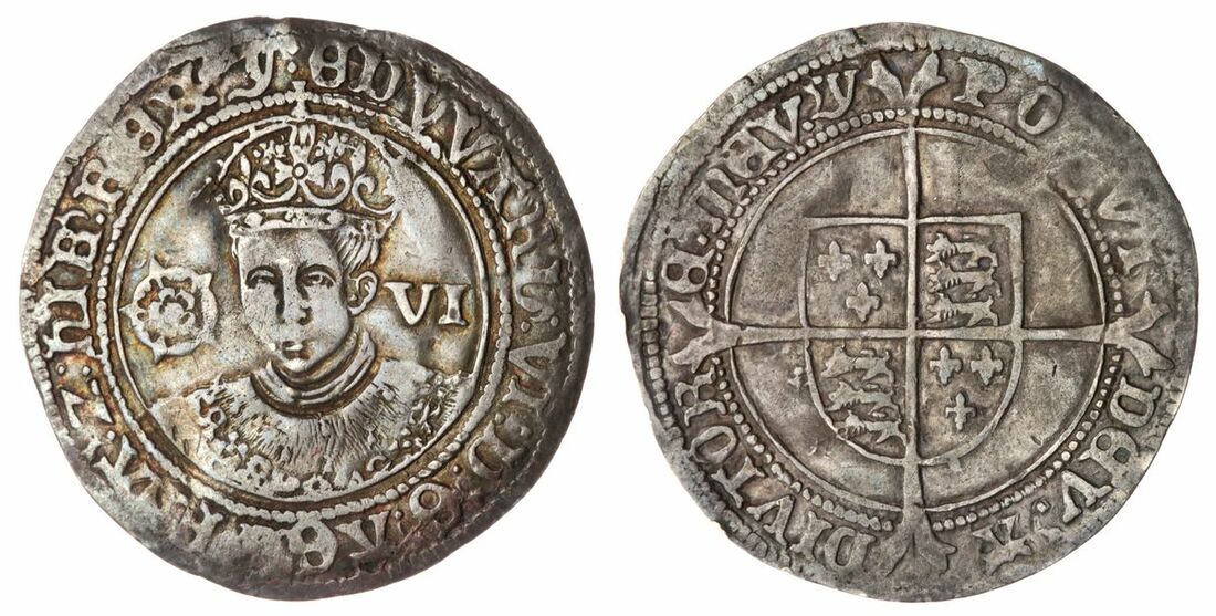 The 'Haddenham' Collection of English Coins | Edward VI (1547-1553), Third Period, (2) Fine Silver Issue Coins, Sixpence, 1551-1553, Southwark (Sir John Yorke), (m.m.) EDWARD '. VI : D .' G .' AGL .' FRA ' Z .' hIB '. REX, large lettering, crowned 'Shilling' bust facing, Tudor rose and VI in fields, rev. POSVI DEV .' A-DIVTOR-E .' MEV .' (m.m.), large lettering, square-topped shield over long cross fourchée, 2.98g [45.8grns], 3h, m.m. y (North 1938; Spink 2483), traces of crimping on an otherwise full round flan, richly toned, almost very fine; and, Threepence, 1551-1553, Tower, crowned bust facing, rose and III in field, rev. square-topped shield over long cross fourchée, 1.35g [20.8grns], 2h, m.m. tun (North 1940; Spink 2485), creased with a small flan split at 1 o'clock, otherwise lightly toned, struck details a really bold fine (2)