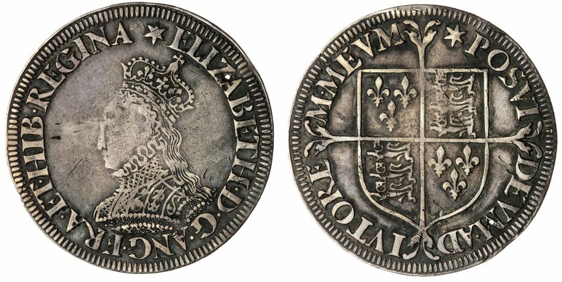 The 'Haddenham' Collection of English Coins | Elizabeth I (1558-1603), Mestrelle's Milled Issue, Large Size, Shilling, 1561-1565, Tower [Upper House], (m.m.) ELIZABETH . D . G . ANG . FRA . ET . HIB . REGINA, crowned bust left, ornately decorated bodice, rev. (m.m.) POSVI DEVM . ADIVTOREM . MEVM . square-topped shield over long cross fourchée, 6.10g [94.2grns], 6h, m.m. star (North 2023; Spink 2590), rubbed and creased, lightly toned, a bolder fine