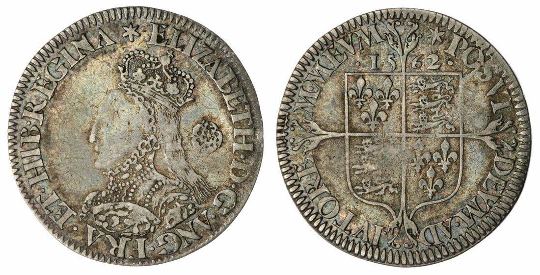 The 'Haddenham' Collection of English Coins | Elizabeth I (1558-1603), Mestrelle's Milled Issue, (2) Sixpences, 1562, Tower [Upper House], (m.m.) ELIZABETH o D o G o ANG o FRA o ET o HIB o REGINA, shorter broad bust D left, with ornately decorated bodice, small Tudor rose behind, rev. (m.m.) POSVI DEVM o AD-IVTOREM o MEVM, square-topped shield over long cross fourchée, edge plain, 3.00g [46.4grns], 7h, m.m. star (Borden/Brown 26; North 2027; Spink 2596), rub to portrait, otherwise lightly toned, further accentuated by lustre and bluish-flare in recesses, almost very fine; another 3.04g [47.0grns], 6h, m.m. star, creased and cleaned with toning spots, handsomely bluish retone before portrait, very fine (2)