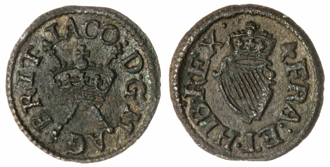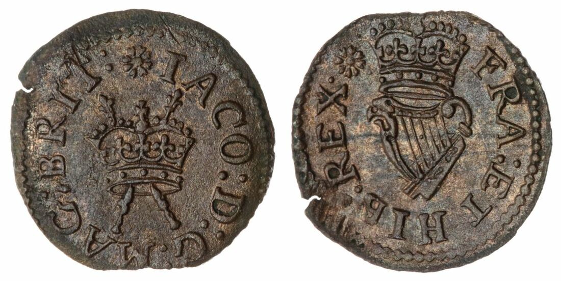 The 'Haddenham' Collection of English Coins | James I (1603-1625), (6) Copper Farthings, including: 'Harrington' Type 1a, London, IACO · D · G · M AG · BRIT, crown over sceptres centrally with legend around, rev. FRA : ET · HIB : REX, crowned harp centrally with legend around, 0.46g, 6h (Spink 2674), appealing round flan, well struck and evenly toned, very fine; and, Type 2, mm. trefoil, 0.43g, 6h (Spink 2676), appealing round flan, well struck and evenly toned, very fine; and, Type 3b, mm. rose, 0.69g, 6h (Spink 2678), appealing round flan, well struck and evenly toned, very fine; and, 'Lenox' Type 2, mm. cinquefoil, 0.73g, 6h (Spink 2679), chipped flan, bold features, toned, fine; Type 3c, mm. trefoil, 0.41g, 12h (Spink 2679), chipped and cracked flan, toned, fine; and, mm. crescent, 0.39g, 6h (Spink 3183), slightly off centre striking, softness throughout, toned, good fine (6)