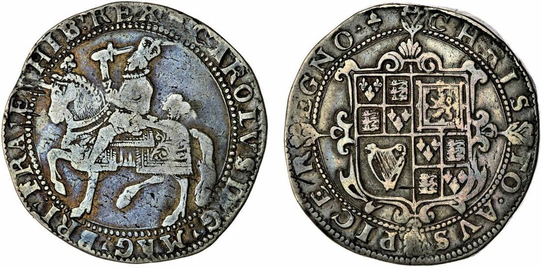 The 'Haddenham' Collection of English Coins | Charles I (1625-1649), Group I, Type 1a3, Crown, 1625-1626, Tower (under King), (m.m.) • CAROLVS D.' G.' MAG.' BRI.' FRA.' ET HIB.' REX •, first horseman King trotting left, ornately decorated caparison, sword over right shoulder only breaking wire line but not inner circle, plume on head-dress and on housing, rev. CHRIS | TO • AVS | PICE • R | EGNO • (m.m.), square-topped and garnished shield over cross fourchée, 28.77g [444.0grns], 2h, m.m. lys (Hawkins 1a; Francis 1a; FRC IV/I [sale lot 43]; Brooker 232 same dies; North 2190; Spink 2753), faint metal stresses in cabinet toned fields, and historic gouges before horse and by R in REGNO, otherwise evenly worn, better than fair / fine, scarce