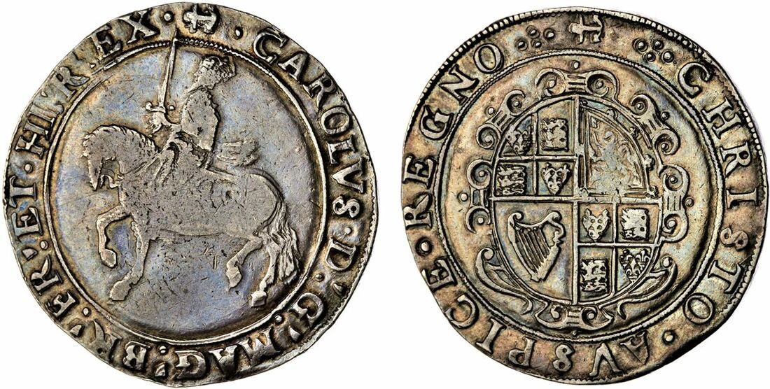 The 'Haddenham' Collection of English Coins | Charles I (1625-1649), Group III, Type 3a, Crown, 5 May 1638 - 3 July 1639, Tower (under King), (m.m.) • CAROLVS • D.' G.' MAG.' BR.' FR.' ET • HI.' REX ••:•• third horseman King trotting left, sword upright, no ground line, rev. (m.m.) •:• CHRISTO • AVSPICE • REGNO •:• N inverted in REGNO, oval shield with five even 'barrel' garniture, 29.99g [462.8grns], 2h, m.m. anchor [to right, straight flukes over tun / rounded flukes] (Hawkins 3a; Francis 3a [no. 34]; FRC XVII*/XXIV [sale lot 80 this coin]; Brooker 262 same dies; Thorpe [1921], 91 same dies; Parsons [1929], 517 same dies; Paget 78 same dies; Raynes = Nightingale 52 same dies; Lockett 3389 same dies; North 2195; Spink 2758), slightly doubled by REX and rubbed on softly-struck portrait, otherwise richly toned, good fine / very fine, scarce