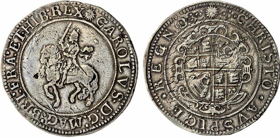 The 'Haddenham' Collection of English Coins | Charles I (1625-1649), Group IV, Type 4, Crown, 13 May 1645 - 15 February 1646, Tower (under King), CAROLVS • D.' G.' MAG.' BRI.' FRA.' ET • HIB.' REX, fourth foreshortened horseman left, sword upright, no ground line, rev. •:•• (m.m.) •:• CHRISTO • AVSPICE • REGNO, the G double-entered, oval shield with five even 'barrel' garniture, 29.28g [452.6grns], 6h, m.m. sun (Hawkins 4; Francis 40a; FRC XXIV/XXXVII [sale lot 96]; Brooker 272 same dies; Barr 43; Boismason 2013; Dr Erik Miller 14; North 2198; Spink 2761), minor flan flaws and haymarking across fields, otherwise lightly toned, the centres fine, the peripheries good fine to near very fine