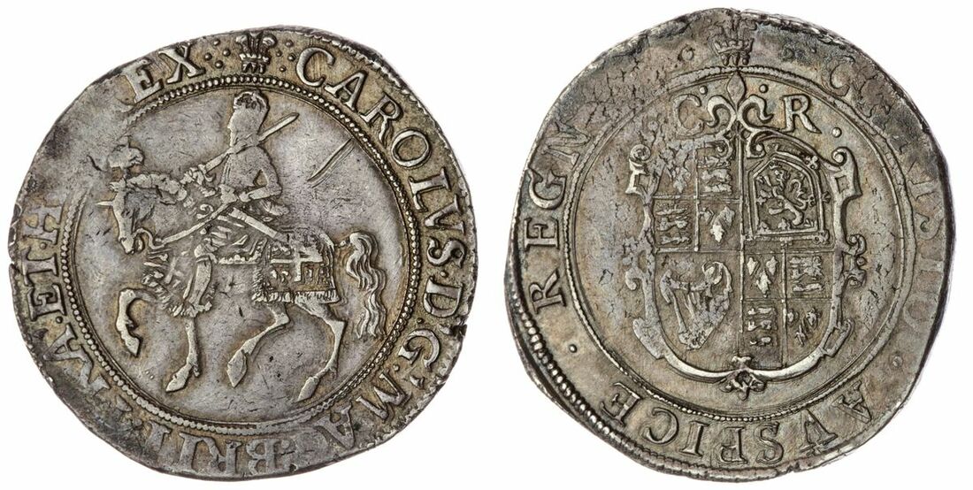 The 'Haddenham' Collection of English Coins | Charles I (1625-1649), Group II, Type 2a, Halfcrown, 1630-1631, Tower (under King), (m.m.) •:• CAROLVS • D .' G .' MAG .' BRIT .' FRA .' ET • HI [.' R]EX •:•  second horseman King trotting left, sword over right shoulder, plume on headdress, cross on housing, rev. (m.m.) • CHRISTO • AVSPICE • REGNO [• : ]•, oval garnished shield, C-R divided by lys above, 14.94g [230.6grns], 3h, m.m. plume (Bull 104a/15; Hawkins 2a; Francis 2a; Brooker 301; North 2205; Spink 2769), historic scratch in right field and peripheral striking softness, otherwise handsomely cabinet toned with some underlying flare in recesses, struck details bolder than fine and verging on very fine in most places, scarce