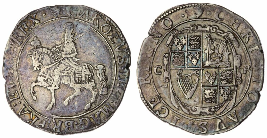 The 'Haddenham' Collection of English Coins | Charles I (1625-1649), (2) Group II, Type 2c, Halfcrown, 1632-1633, Tower (under King), (m.m.) o CAROLVS o D .' G .' MAG .' BR .' FRA .' ET o HI .' REX o  second horseman King trotting left, sword over right shoulder, plume on headdress, cross on housing, rev. (m.m.) o CHRISTO   AVSPICE   REGNO o  oval garnished shield, dividing C-R across field, 14.93g [230.2grns], 5h, m.m. harp (Bull 179/20; Hawkins 2c; Francis 2c; Brooker 310-313; North 2207; Spink 2771), some peripheral striking splits and resultant softness, otherwise nicely toned with flares of blue in first quarter of reverse, good fine, the reverse pleasingly so, scarce; another, 14.29g [220.6grns], 5h, m.m. portcullis (Bull 199/[?]; Hawkins 2c; Francis 2c; Brooker 315-317; North 2207; Spink 2771), some minor verdigris staining to reverse and general surface roughness, otherwise of good fabric with traces of doubling in legends, strictly fine for strike (2)