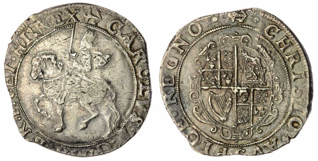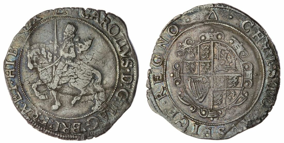 The 'Haddenham' Collection of English Coins | Charles I (1625-1649), (3) Group III, Type 3a², Halfcrown, 1638-1639, Tower (under King), (m.m.) CAROLVS o D .' G .' MA .' BR .' FR .' ET o HI .' REX third horseman King trotting left, sword upright, rev. (m.m.) o CHRISTO o AVSPICE o REGNO o oval garnished shield, 15.24g [235.2grns], 10h, m.m. anchor / anchor over tun [straight flukes to right] (Bull 320/23; Hawkins 3a²; Francis 3c; Brooker 345; North 2211; Spink 2775), on an irregular 'dumpy' flan of full weight, lightly toned, good fine / very fine; another, 14.91g [230.0grns], 2h, m.m. triangle (Bull 348b/23; Hawkins 3a²; Francis 3c; Brooker 348-351; North 2211; Spink 2775), on an irregular 'dumpy' flan of fuller weight, and light metal stressing, otherwise toned and peripherally lustrous with hints of bluish accentuation, a bolder fine; another, 15.14g [234.0grns], 10h, m.m. star [over triangle on obv. ?] (Bull -/- dies unlisted; Hawkins 3a²; Francis 3c; Brooker -; North 2211; Spink 2775), heavily doubled with resultant flatness, lightly toned and residually lustrous, struck details a bolder fine, evidently very rare as not represented in the Brooker collection nor the Bull corpus (3)