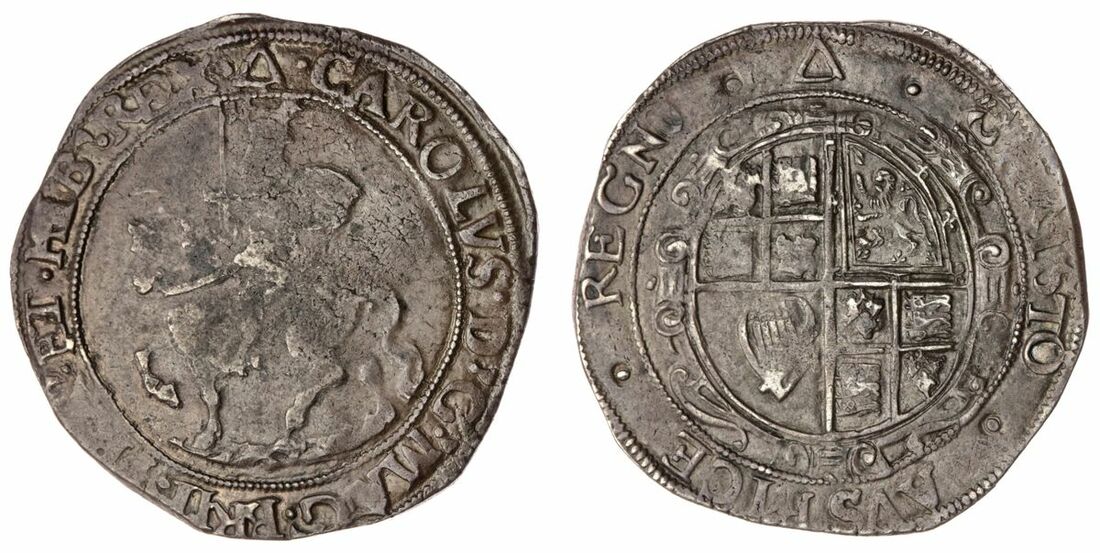 The 'Haddenham' Collection of English Coins | Charles I (1625-1649), (2) Group III, Type 3a3, Halfcrown, 1639-1640, Tower (under King), (m.m.) CAROLVS o D .' G .' MAG .' BRI .' FRA .' ET o HIB .' REX  third horseman King trotting left, sword upright, rough ground below, rev. (m.m.) o CHRISTO o AVSPICE o REGNO o  oval garnished shield, 14.49g [223.6grns], 2h, m.m. triangle (Bull 386b/32; Hawkins 3a²; Francis 3c; Brooker 348-351; North 2212; Spink 2776), traces of doubling and striking softness across a broad flan, toned, fine and largely better; and, 15.05g [232.2grns], 5h, m.m. star over triangle (Bull 403/32; Hawkins 3a²; Francis 3c; Brooker 353; North 2211; Spink 2775), bright but lustrous on an irregularly sheared flan, a bolder fine, the overmark crisp and clear (2)
