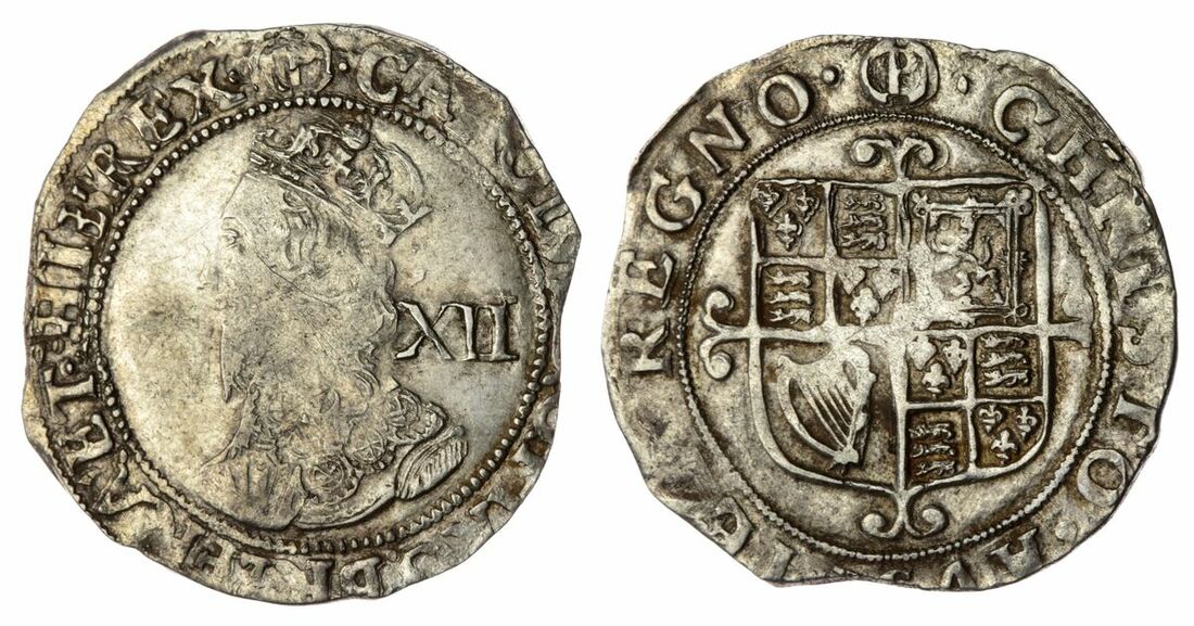 The 'Haddenham' Collection of English Coins | Charles I (1625-1649), Group F, Type 4.4, Shilling, 1643-1644, Tower [under Parliament], (m.m.) • CAROLVS • D .' G .' MAG .' BRI .' FRA .' ET • HIB .' REX • sixth crowned bust left, wearing falling lace collar, large XII behind, rev. • CHRISTO • AVSPICE • REGNO • (m.m.), square-topped shield over short cross moline, 5.49g [84.8grns], 2h, m.m. (P) [over triangle-in-circle on rev. (?)] (Brooker 552/551; Francis 4c; Hawkins 4.4; Sharp G1/2; North 2232; Spink 2800), irregular flan, lightly toned, almost very fine, scarce