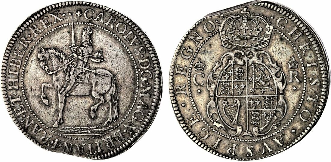 The 'Haddenham' Collection of English Coins | Charles I (1625-1649), First Milled Issue, Crown, 1631-1632, Tower, under Nicholas Briot, (m.m.) CAROLVS • D : G • MAGN • BRITAN • FRAN • ET • HIBER • REX •, Briot's horseman left, sword upright, grassy ground line, rev. • CHRISTO • AVSPICE • REGNO • (m.m.), crowned and garnished oval shield, dividing crowned C-R, 29.69g [457.8grns], 6h, m.m. flower and B / B (Brooker 714 same dies; Slaney II, 339 same dies; North 2297; Spink 2852), planchet clumsily sheared at the Mint, otherwise lightly toned, very fine for strike, the reverse pleasingly so, scarce