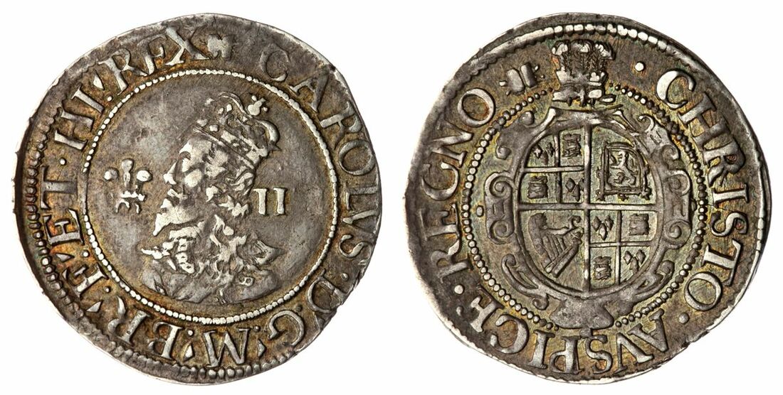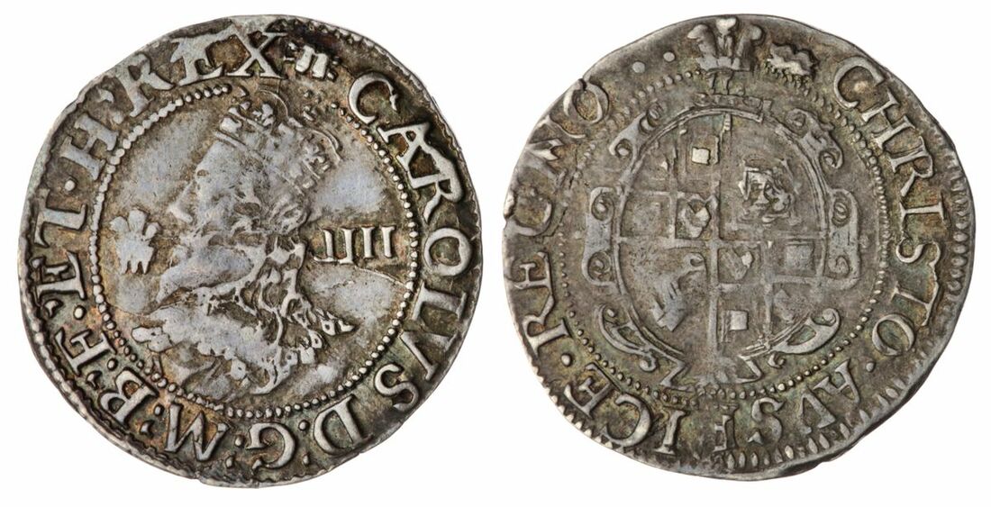 The 'Haddenham' Collection of English Coins | Charles I (1625-1649), (4) Royalist Aberystwyth Groats, CAROLVS D G M BR F ET HI REX, crowned bust left, rev. CHRISTO AVSPICE REGNO, garnished oval shield of arms, plume above, mm. book, 1.94g, [30.0grns], 6h (North 2337; Spink 2891), wear throughout, toned, good fine; another, mm. book, 1.90g, [29.4grns], 9h (North 2338; Spink 2892), wear throughout, toned, good fine; another, mm. book, 2.01g, [31.2grns], 3h (North 2338; Spink 2892), wear throughout, toned, good fine; another, mm. book, 1.96g, [30.0grns], 3h (North 2339; Spink 2893), split in flan, slightly bent, cracks about edges, evenly toned, fine (4)