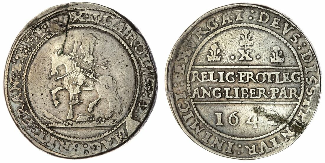 The 'Haddenham' Collection of English Coins | Charles I (1625-1649), Civil War Issues, Royalist Shrewsbury, 'Declaration' Half-Pound of 10-Shillings, 1642, (i.m.) CAROLVS : D : [G :] MAG : BRIT : FRAN : ET : HI : REX •, armoured King on horseback left, horse plain, trampling arms amongst grassy ground below, rev. : EXVRGAT : DEVS : DISSIPENTVR : INIMICI, Wellington Declaration in two lines reading RELIG • PROT • LEG | ANG • LIBER • PAR in two lines, value and three Shrewsbury plumes above, 1642 below, 59.63g [920.2grns, 8h, i.m. plume / - (Brooker 804 same dies; North 2368; Spink 2924), heavily and crudely repaired at site of planchet crack to date, the edges resultingly filled and smoothed, otherwise struck details bordering fine in most parts, an entry level gap filler of this ludicrous and popular Civil War oversized issue