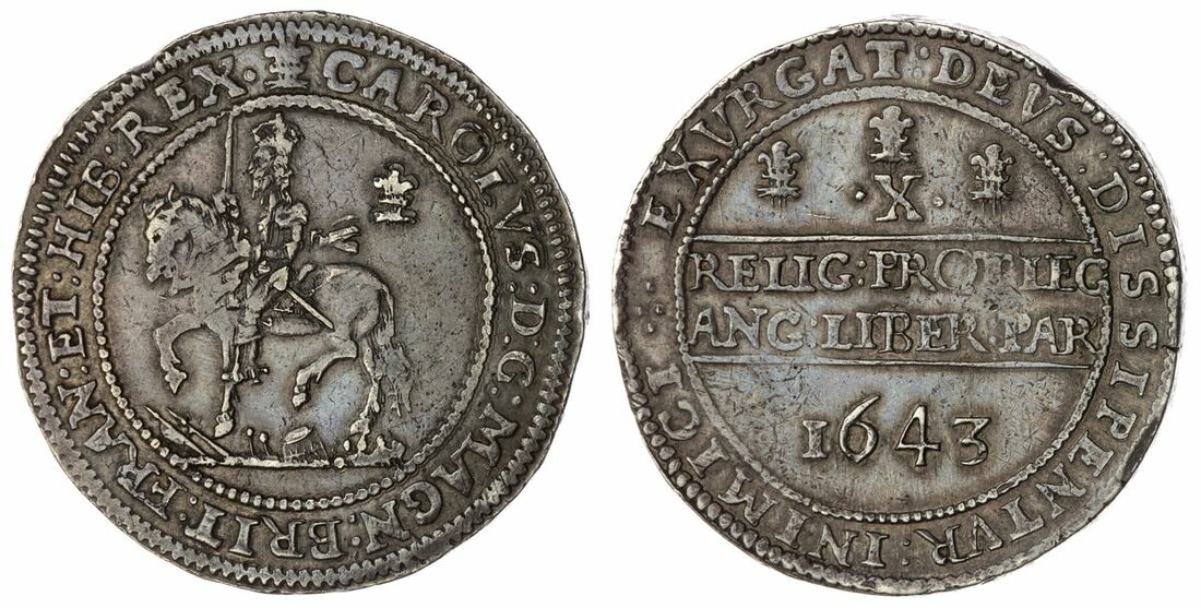 The 'Haddenham' Collection of English Coins | Charles I (1625-1649), Civil War Issues, Royalist Oxford, 'Declaration' Half-Pound of 10-Shillings, 1643, New Hall Inn, (m.m.) CAROLVS: D: G: MAGN: BRIT: FRAN: ET: HIB: REX., 'Shrewsbury' horseman King left, small plume behind, trampling broken arms below, rev. EXVRGAT : DEVS : DISSIPENTVR : INIMICI •:•, Wellington Declaration in two lines reading RELIG : PROT: LEG | ANG : LIBER : PAR, value and three plumes with bands above, date below, 60.25g [929.8grns], 12h, m.m. plume with bands [on obv. only] (Hawkins 2; Morr. A-1 [BNJ, 1921, Pl. II, nos. 9/12]; Brooker Appendix I, no. 15; Cumberland Clark 68; Bruun 779; Wheeler 419; Lockett 2443; Burstal 403; North 2404; Spink 2945A), a minor flan crimp at 11 o'clock, otherwise most handsomely cabinet toned across a broad round flan, a hint of striking softness in parts and the occasional area of rubbing, nevertheless very fine, rare