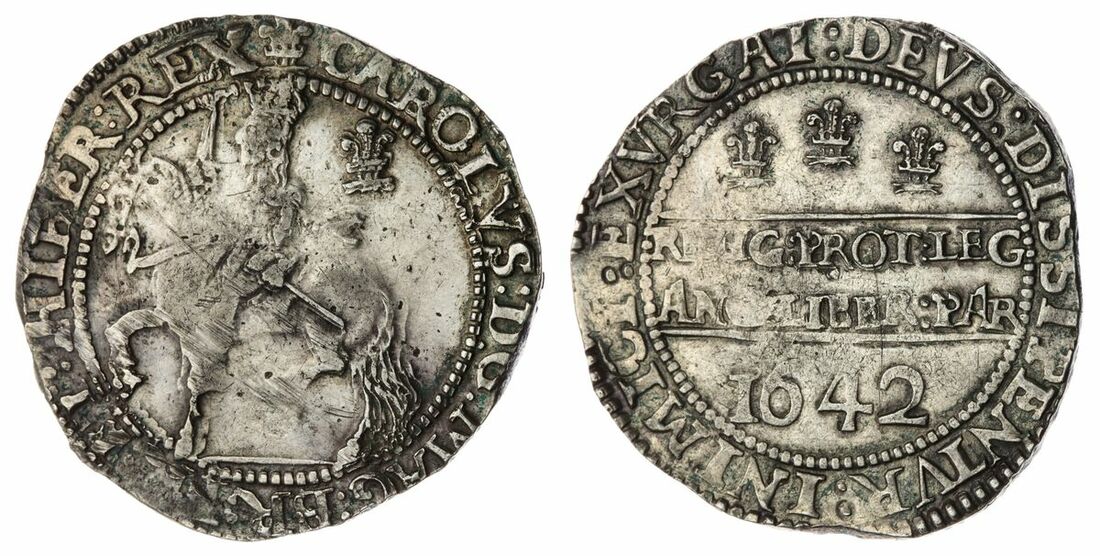 The 'Haddenham' Collection of English Coins | Charles I (1625-1649), Civil War Issues, Royalist Oxford, 'Declaration' Halfcrown, 1642, New Hall Inn, (m.m.) CAROLVS : D : G : MAG : BR : FR : ET : HIBER : REX, R over L in CAROLVS, 'Oxford' horseman King trotting left, sword upright, plume behind with bands, ground line below, rev. : EXVRGAT : DEVS : DISSIPENTVR : INIMICI • Wellington Declaration reading: RELIG : PROT : LEG | ANG : LIBER : PAR in two lines, 1642 below, three even Oxford plumes above, 15.22g [234.8grns], 12h, m.m. plume [on obv. only] (Bull 591/C [Oxford Mint, 2023], [X-IS / C-P] [Ox. 1-3-c-D6c-1-I] this coin; Morrieson C-3 [blundered P in PAR]; Brooker 880/- same obverse die; Dawson -; North 2411; Spink 2952), lightly scuffed on legs, otherwise lightly toned, centres a bolder fine, the peripheries very fine, scarce