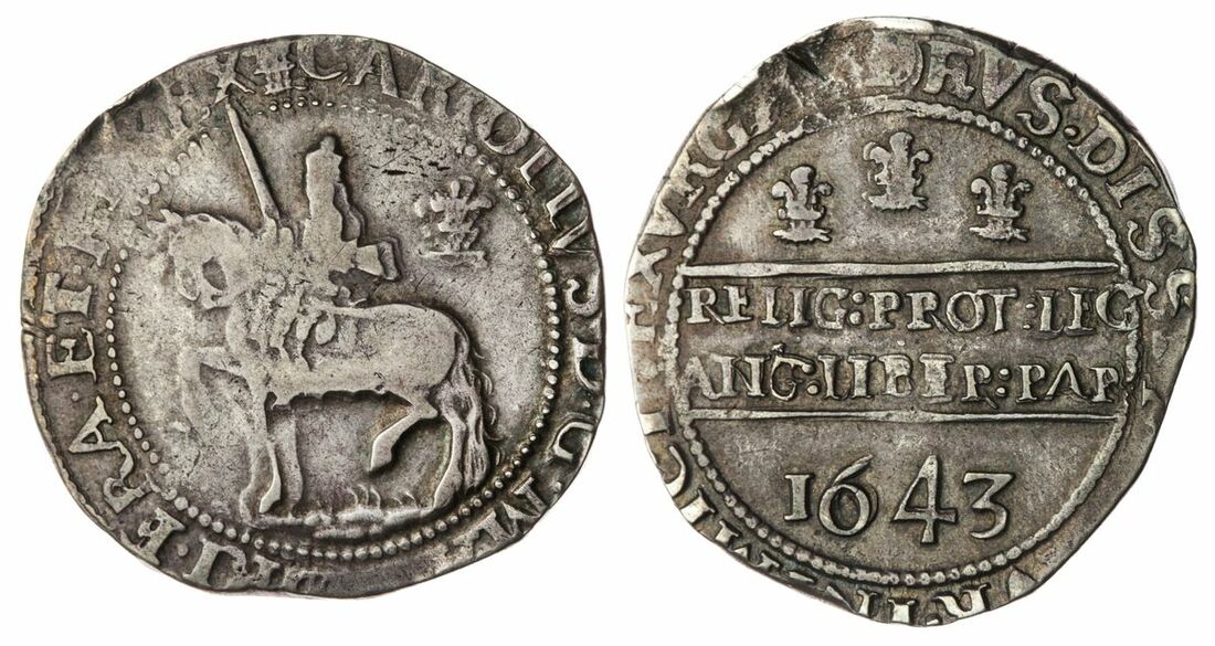 The 'Haddenham' Collection of English Coins | Charles I (1625-1649), Civil War Issues, Royalist Oxford, 'Declaration' Halfcrown, 1643, 'Intermediate Period', New Hall Inn, (m.m.) CAROLLVS • D • G • MA[G •] BRI • FRA • ET • HI • REX, Briot's squat horseman King trotting left, sword upright, plume behind sash with bands, rough and grassy ground line, rev. • EXVRGAT • DEVS • DISSIPENTVR • INIMICI Wellington Declaration reading: RELIG : PROT : LEG | ANG : LIBER : PAR in two lines, 1643 below, three even Oxford plumes above, 14.23g [220.0grns], 2h, m.m. plume [on obv. only] (Bull 604/B [Oxford Mint, 2023], [X-S / I-PE] [Ox. 1-2-p-D6c-11-IM] this coin; Morrieson obv. die H; Brooker 893-895; Dawson - [cf. 55]; North 2416; Spink 2956), test cut on reverse at 11 o'clock and traces of doubling to portrait, otherwise softly toned with hints of metal stressing by plume, strictly fair to almost fine / good fine, scarce, only two examples documented by Bull, the other in the British Museum collection, and this earmarked for acquisition by the Ashmolean