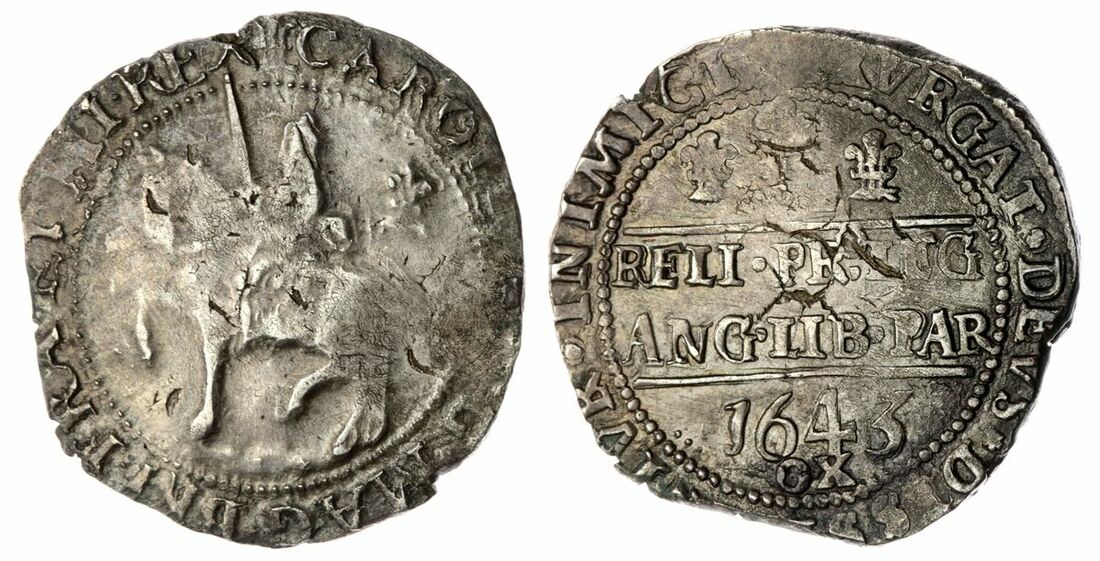 The 'Haddenham' Collection of English Coins | Charles I (1625-1649), Civil War Issues, Royalist Oxford, 'Declaration' Halfcrown, 1643, 'Last Period', New Hall Inn, (m.m.) CAROLLVS • D • G • MAG • BRI • FRA • ET • HI • REX, Briot's squat horseman King trotting left, sword upright, plume behind sash with bands, lumpy ground line, rev. • EXVRGAT • DEVS • DISSIPENTVR • INIMICI Wellington Declaration reading: RELI • PR° : LEG | ANG • LIB • PAR in two lines, 1643 | OX below, three even Oxford plumes above, rosette stops, 14.97g [231.0grns], 2h, m.m. plume [on obv. only] (Bull 604/J [Oxford Mint, 2023], [I-T / R-VS] [Ox. 2-23-*-D25p-10-E] this coin, albeit provenance incorrectly listed; Morrieson obv. die H; Brooker 898; Dawson - [cf. 53]; North 2422; Spink 2957), heavier metal stressing and flaws with traces of doubling to peripheries, otherwise lightly toned, strictly fair to fine / almost very fine in most parts, scarce