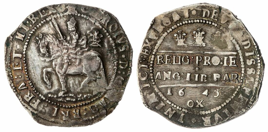 The 'Haddenham' Collection of English Coins | Charles I (1625-1649), Civil War Issues, Royalist Oxford, 'Declaration' Halfcrown, 1645, 'Last Period', (m.m.) CAROLVS • D : G : MAG : BRI : FRA : ET : HI : REX, Briot's squat horseman King trotting left, sword upright, plume behind sash with bands, lumpy ground line, rev. :•: EXVRGAT • DEV[S •] DISSIPENTVR • INIMICI, Wellington Declaration reading: RELIG : PRO : LE | ANG : LIB : PAR in two lines, 16-45 | OX below, three even Oxford plumes above, 14.22g [219.2grns], 7h, m.m. plume [on obv. only] (Bull 622/A [Oxford Mint, 2023], [EX-D / MI-P] [Ox. 2-4-p-D19c-10-NI] this coin; Morrieson A-3, [Sale, lot 534 same obverse die]; Brooker 912-913; Dawson - [cf. 60]; North 2424; Spink 2959), peripheral stress marking and some delamination at 5 o'clock, some minor striking softness at extremities on an irregular flan, otherwise richly cabinet toned with traces of residual lustre, the O of PRO struck flat, a pleasing very fine or better for issue, very rare with an excellent pedigree, one of only two specimens known to Bull from this die pairing, this by far the finer and thus earmarked for accession to the Ashmolean