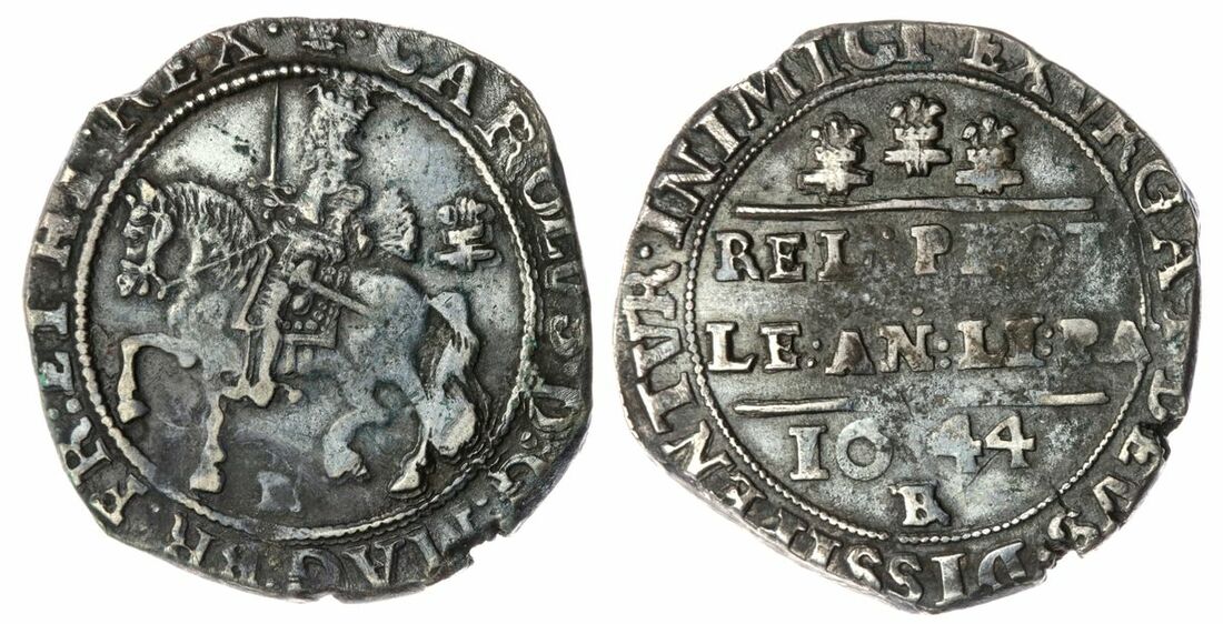 The 'Haddenham' Collection of English Coins | Charles I (1625-1649), Civil War Issues, Royalist Bristol, 'Declaration' Halfcrown, 1644 BR, (m.m.) • CAROLVS • D : G : MAG : BR : FR : ET : HI : REX • horseman King trotting left, sword upright, plume behind sash with bands, BR below, rev. EXVRGAT • DEVS • DISSIPENTVR • INIMICI Wellington Declaration reading: REL : PROT : | LE : AN : LI : PA in two lines, 1644 | BR over inverted BR below, three even plumes above, 15.90g [245.6grns], 2h, m.m. plume [on obv. only] (Morrieson D-6; Brooker 985; Dawson 68; North 2491; Spink 3009), on an irregular flan, flecked and with areas of striking softness, otherwise rich bluish-gray tone, about very fine, scarce