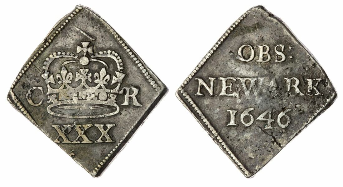 The 'Haddenham' Collection of English Coins | Charles I (1625-1649), Civil War Issues, Siege of Royalist Newark, Halfcrown, 1646, double-arched crown dividing regnal cypher, value below, rev. OBS: | NEWARK | 1646 in three lines, 14.55g [224.4grns], 12h (Hird 246; Brooker 1222 same dies; Bull 688; North 2638; Spink 3140A), usual die flaws and metal flaws, otherwise lightly toned, some flatness to centres, otherwise almost very fine, an iconic and enduringly popular 'Lozenge' Civil War Issue