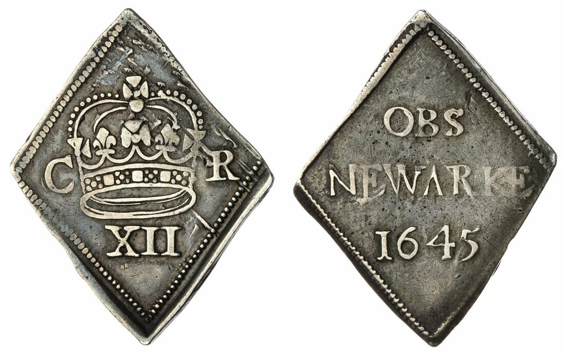 The 'Haddenham' Collection of English Coins | Charles I (1625-1649), Civil War Issues, Siege of Newark(e), Shilling, 1645, taller crown with pearls and jewels on band, dividing cypher, rev. OBS NEWARKE 1645 in three lines, 5.70g [87.8grns], 12h (Hird 252-253 same dies; Brooker 1224 same dies; North 2640; Spink 3142), usual die breaks above crown, otherwise well-centred, lightly toned, a really good fine, an iconic and enduringly popular English Civil War 'Siege' coin in a most presentable grade