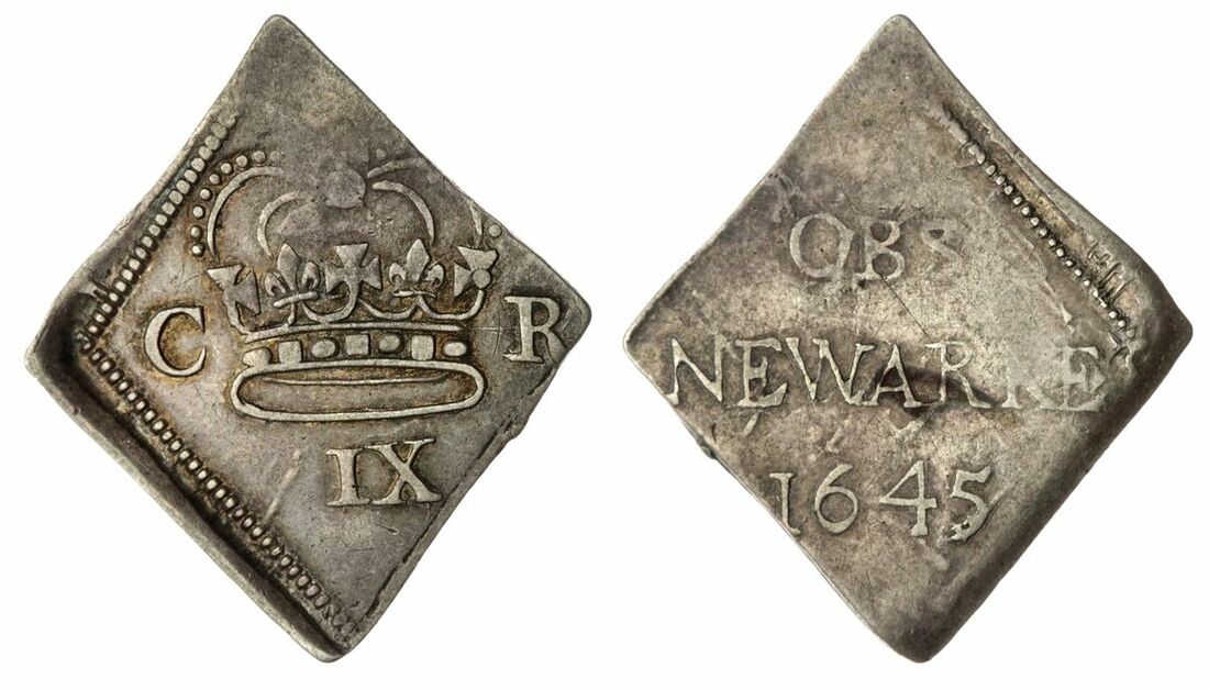 The 'Haddenham' Collection of English Coins | Charles I (1625-1649), Civil War Issues, Siege of Newark(e), Ninepence, 1645, taller crown with pearls and jewels on band, dividing cypher, rev. OBS: NEWARK 1646 in three lines, 4.29g [66.2grns], 12h (Hird 260 same dies; Brooker 1226 same dies; North 2641; Spink 3144), slightly off-struck and the reverse quite flawed, otherwise toned, near very fine, rare, an iconic and enduringly popular English Civil War 'Siege' coin