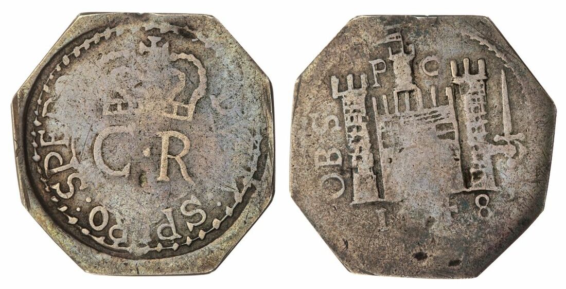 The 'Haddenham' Collection of English Coins | Charles I (1625-1649), Civil War Issues, Siege of Pontefract, Obsidional Shilling, 1648, DVM • SPIRO • SPERO large lettering, crowned large C•R, rev. castle gateway with flag dividing P-C, brandished arm and sword in right field, OBS upwards in left, 5.14g [79.4grns], 12h (Nelson, Fig. 44; Hird 272-274; Brooker 1231; North 2646; Spink 3148), an evidently treasured pocket-piece, well-circulated with a nick to rim at twelve o'clock and dent between cypher, lightly toned, strictly good to fair, but very rare