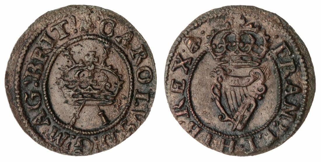The 'Haddenham' Collection of English Coins | Charles I (1625-1649), (6) Copper Farthings, CARO : D : G : MAG : BRI, crown over sceptres centrally with legend around, rev. FRA : ET · HIB : REX, crowned harp centrally with legend around, mm. crescent, 0.39g, 6h (Spink 3183), slightly off centre striking, softness throughout, toned, good fine; another, mm. rose, 0.37g, 6h (Spink 3184), slightly off centre striking, softness throughout, slight bend in flan, daylight hole, toned, good fine; another, mm. rose, 0.55g, 12h (Spink 3185), bold striking, toned, very fine; another, mm. bell, 0.54g, 12h (Spink 3199), bold striking, toned, very fine; and Copper Rose Farthing, CAROLV : D : G : MA : BRI, crown over sceptres centrally with legend around, rev. FRA : ET · HI : REX, crowned Tudor rose centrally with legend around, mm. crescent, 1.01g, 12h (Spink 3203), bold striking, worn, toned, fine; another, mm. crescent, 0.98g, 12h (Spink 3203), bold striking, worn, toned, fine (6)