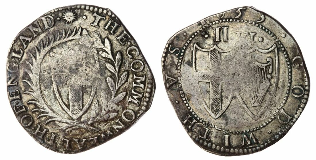 The 'Haddenham' Collection of English Coins | Commonwealth (1649-1660), Halfcrown, 1653, Tower, • THE • COMMONWEALTH • OF • ENGLAND •, English shield within palm and laurel wreath, rev. • 1653 • GOD • WITH • VS, large • II •, small VI • above conjoined shields of England and Ireland, 14.50g [224.0grns], 11h, m.m. sun [on obv. only] (Bull 30; ESC 431; North 2722; Spink 3215), clipped on an irregular flan, flat centres with residual lustre, a bolder fine to peripheries