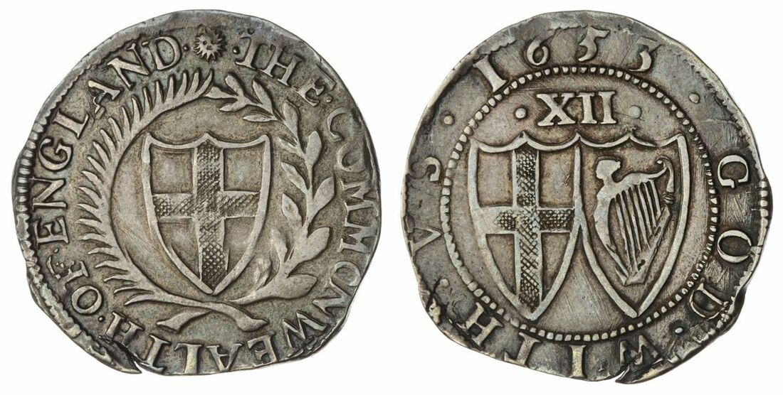 The 'Haddenham' Collection of English Coins | Commonwealth (1649-1660), Shilling, 1653, Tower, • THE • COMMONWEALTH • OF • ENGLAND • English shield within palm and laurel wreath, rev. • 1652 • GOD • WITH • VS, standardised • XII • above conjoined shields of England and Ireland, 5.70g [88.2grns], 12h, m.m. sun (Bull 124; ESC 987; North 2724; Spink 3217), small flan split at 7 o'clock, otherwise handsomely cabinet toned with underlying lustre, about very fine, a pleasing coin