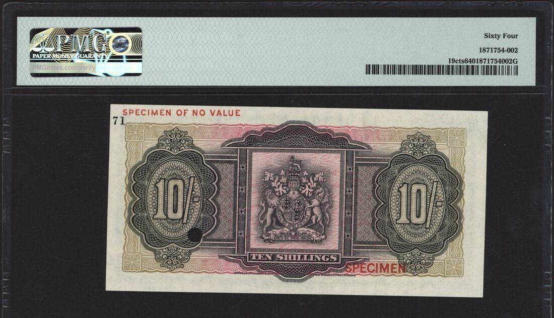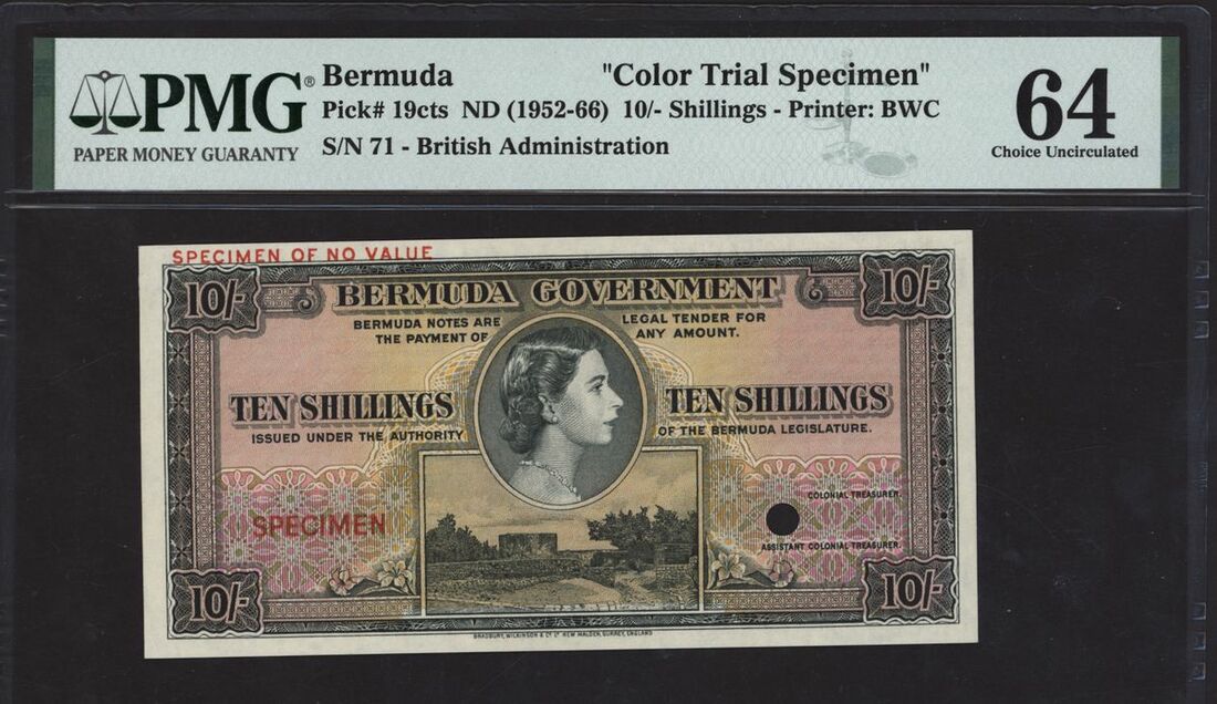(x) Bermuda Government, colour trial specimen 10 shillings, ND (1952-66), serial number 71, (Pick 19cts, BNB 120), in PMG holder 64 Choice Uncirculated, scarce