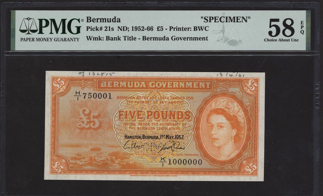 (x) Bermuda Government, specimen £5, 1st May 1957, serial number H/1 75001 / K/1 1000000, (Pick 21s, BNB 122), in PMG holder 58 EPQ Choice About Uncirculated, printer's annotations, only 1 note in a higher grade, as well as the only item with EPQ on PMG Census, scarce