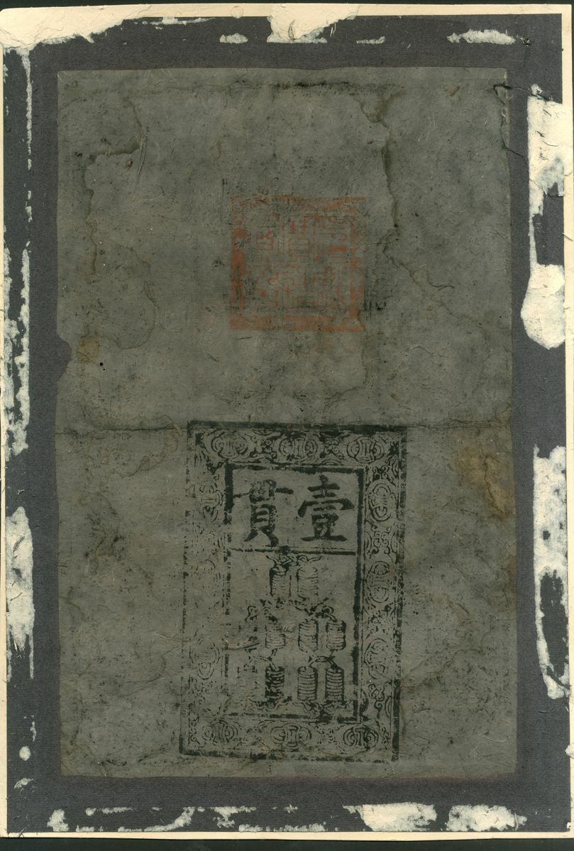 Ming Dynasty, Da Ming Bao Chao, China, 1 kuan, 1368-1399 black text on grey mulberry bark, two rectangular red seals on face, 10 strings of cash at centre
