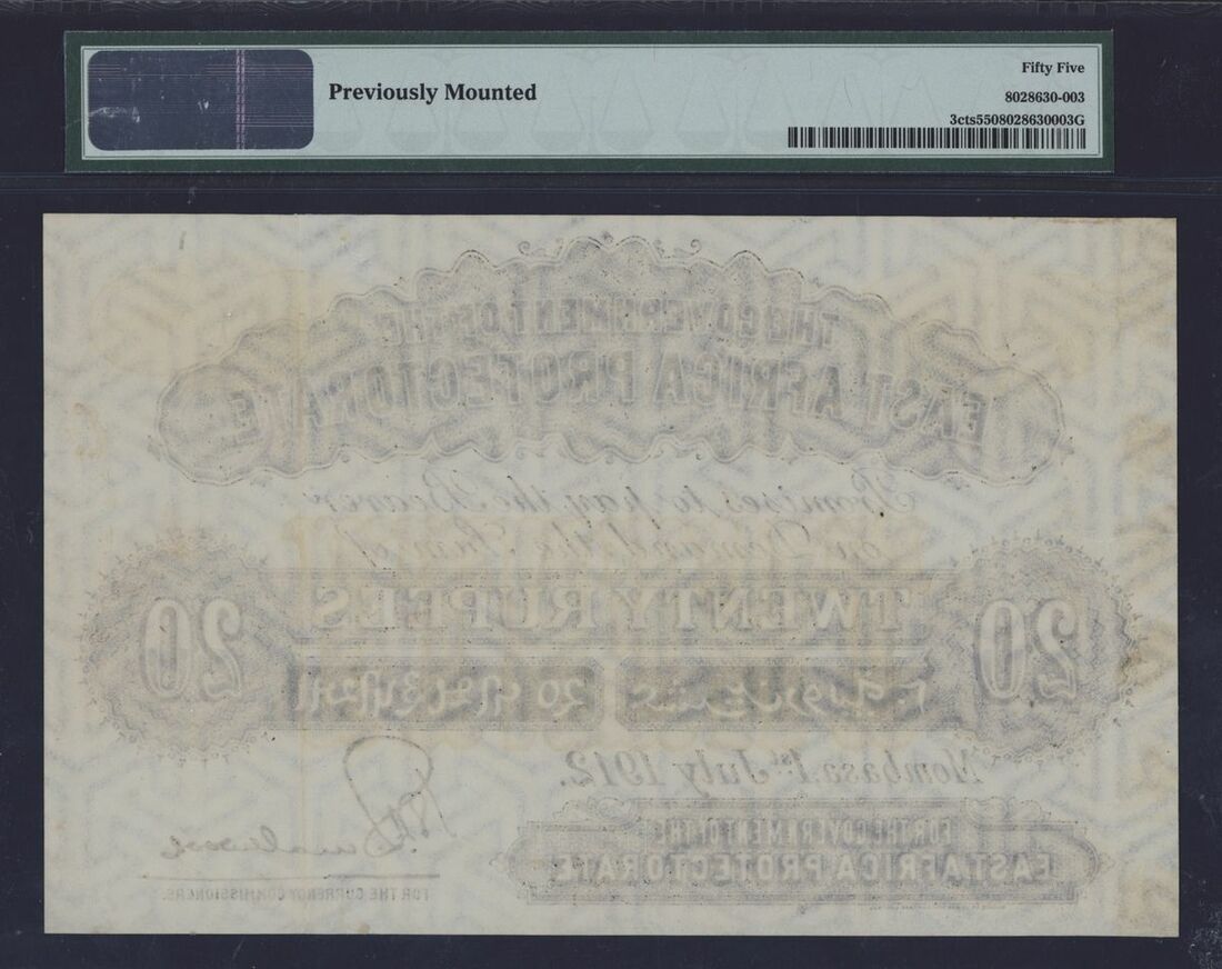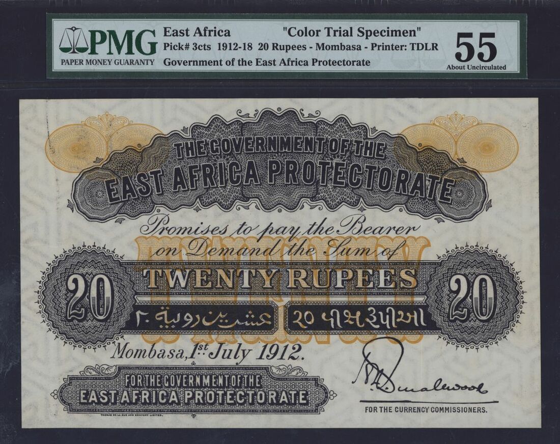 (x) Government of the East Africa Protectorate, colour trial specimen 20 rupees, Mombasa, 1st July 1912, no serial numbers, black and yellow (issued note in black and red),