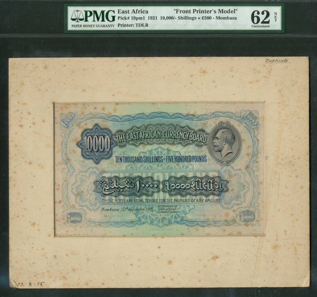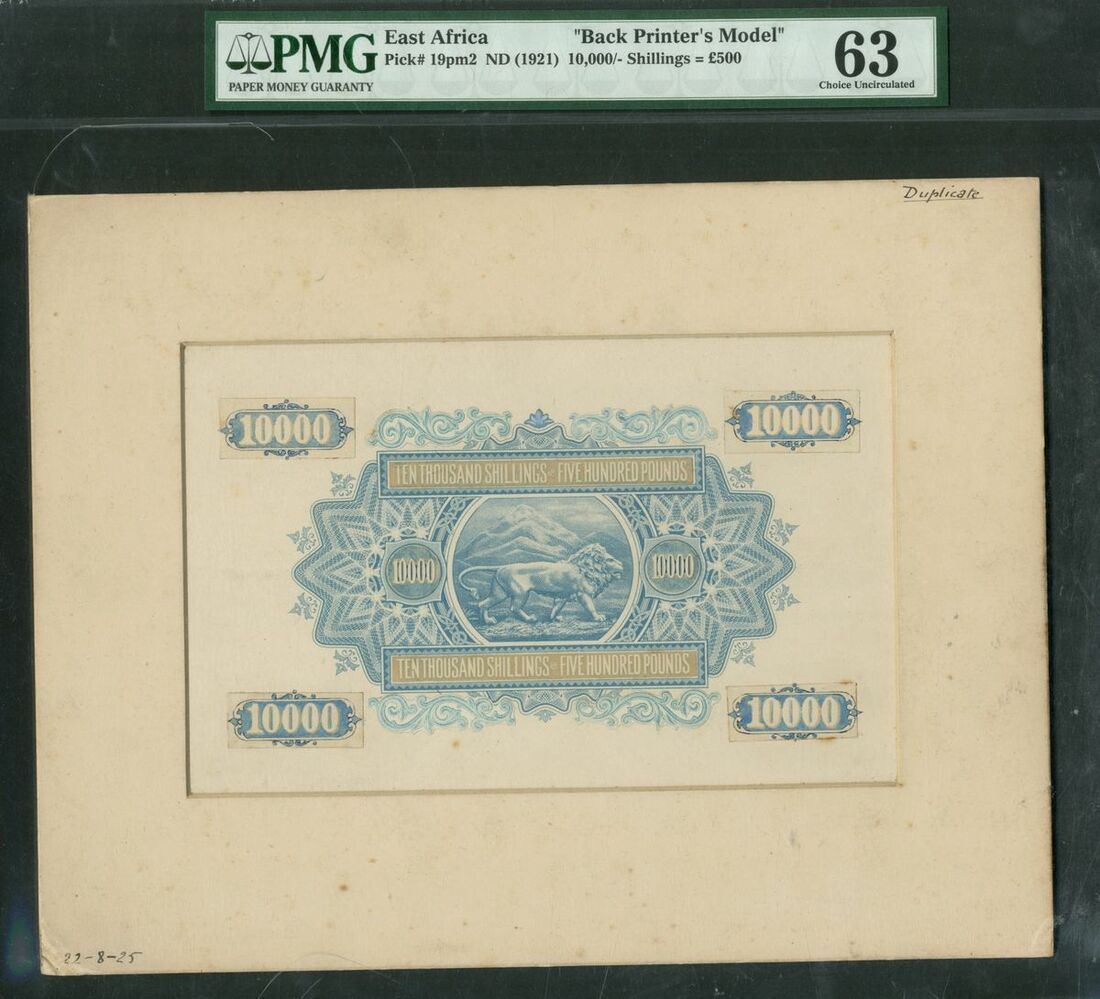 (x) East African Currency Board, East Africa, [Top Pop] pair of front and back printer's models 10,000 shillings, 15th December 1921, (Pick 19pm1, 19pm2, BNB 215), in PMG holders 63 Choice Uncirculated, minor stains, 62 NET Uncirculated, stains, only one of each graded by PMG