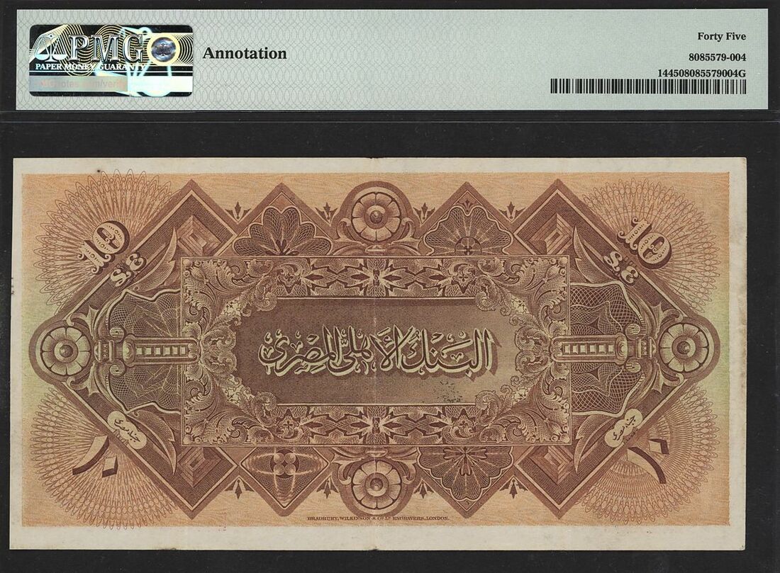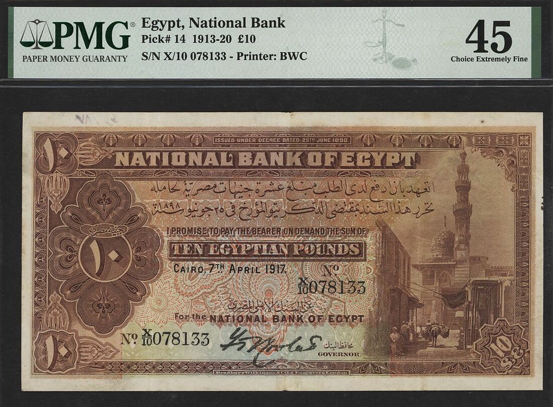(x) National Bank of Egypt, £10, 7th April 1917, serial number X/10 078133, (Pick 14, BNB 112), in PMG holder 45 Choice Extremely Fine, annotation