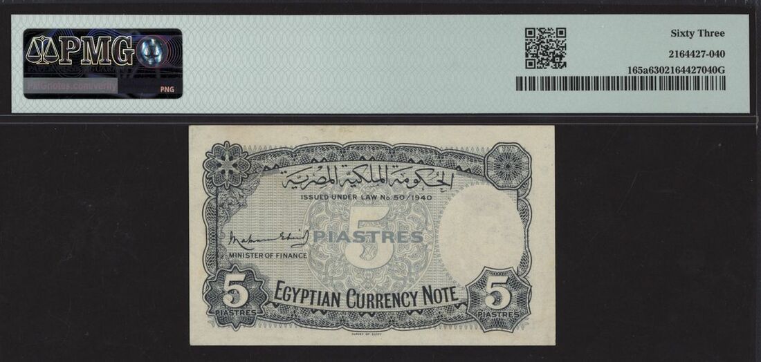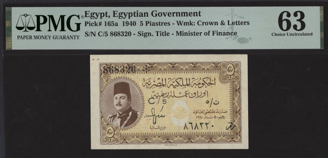 (x) Egyptian Currency Note, Egypt, 5 piastres, 1940, serial number C/5 868320, (Pick 165a, BNB 212), in PMG holder 63 Choice Uncirculated