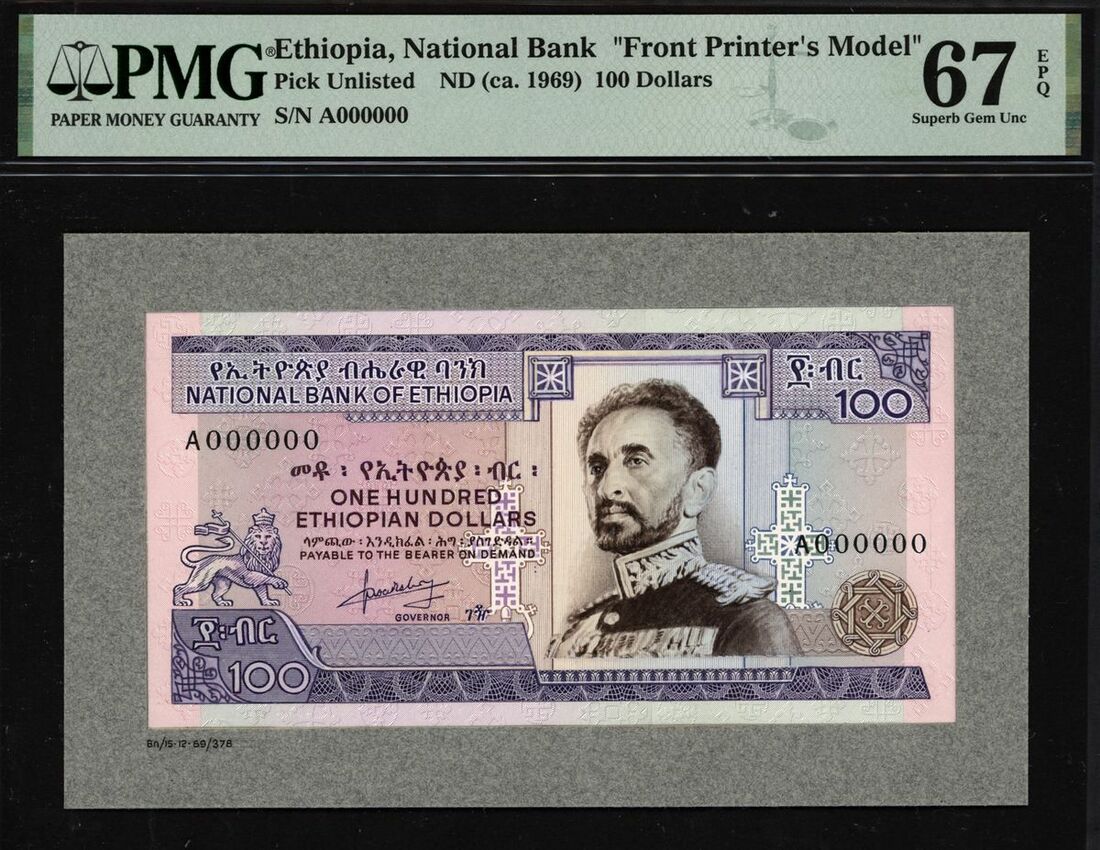 National Bank of Ethiopia, an obverse composite essay for an unissued 100 Ethiopian dollars, 1969, serial number A000000, light pink and purple, Lion of Judah at left, Emperor Haile Selassie I at right,