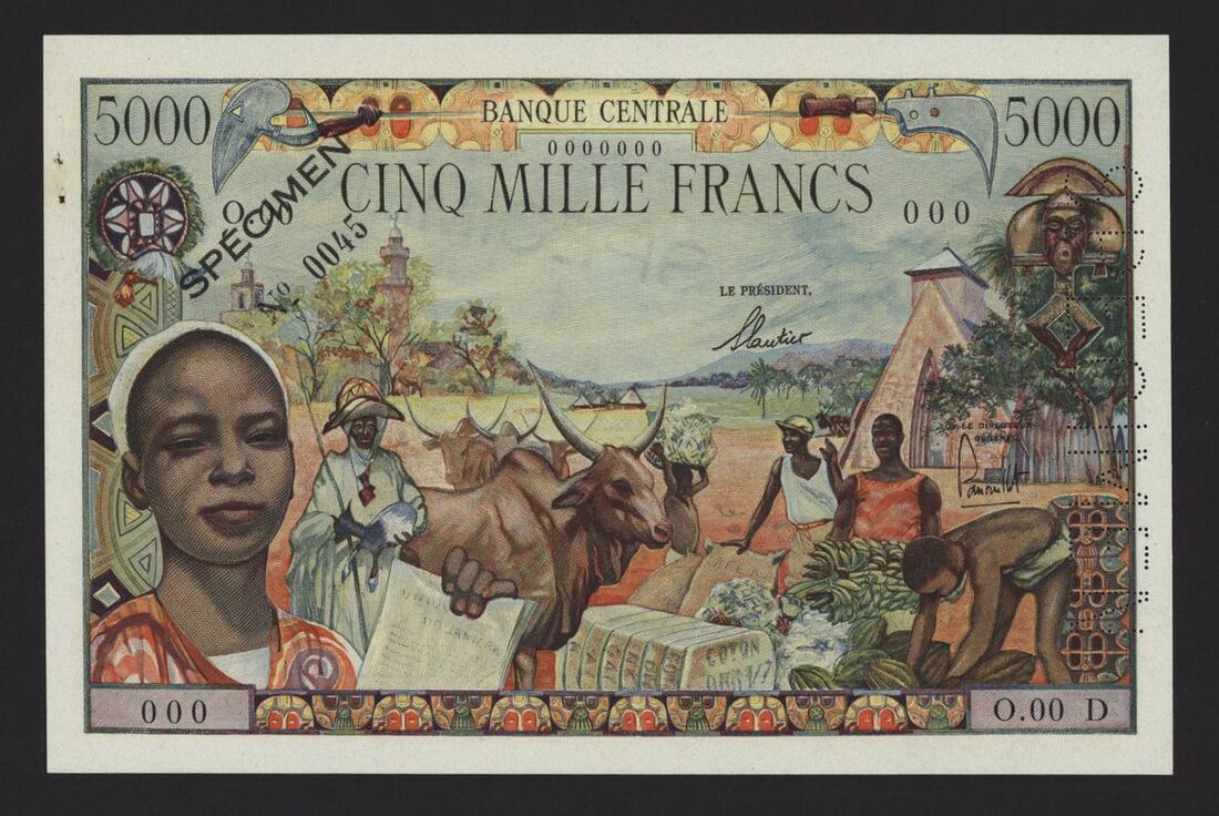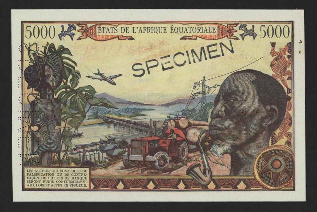 (x) Banque Centrale Etats de L'Afrique Equatoriale, Equatorial African States, specimen 5000 francs, ND (1963), serial number O.00 000 0045, (Pick 6ds, BNB 204s), about uncirculated, staple holes, rust