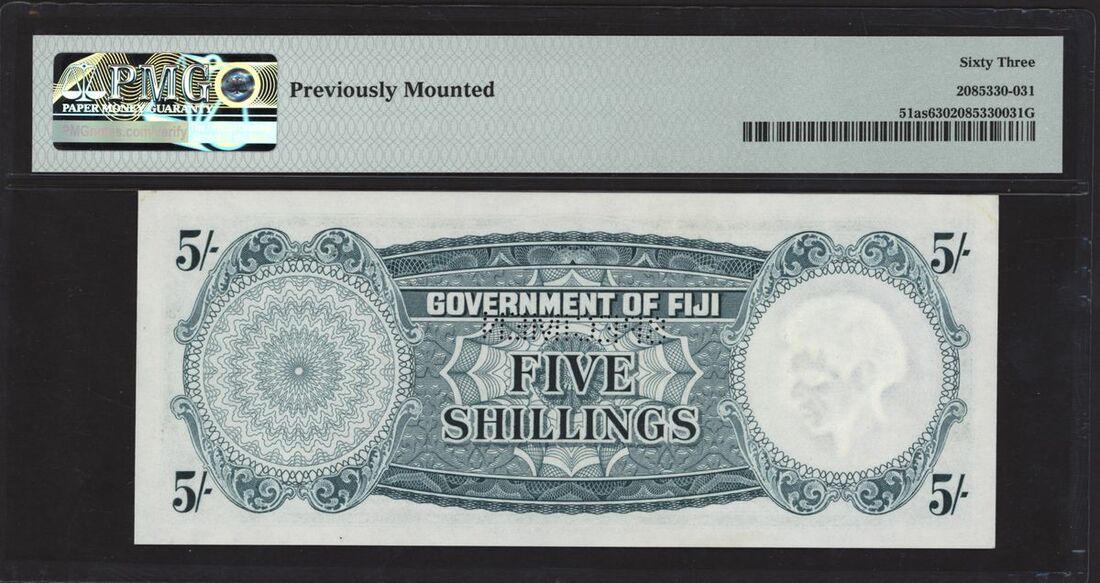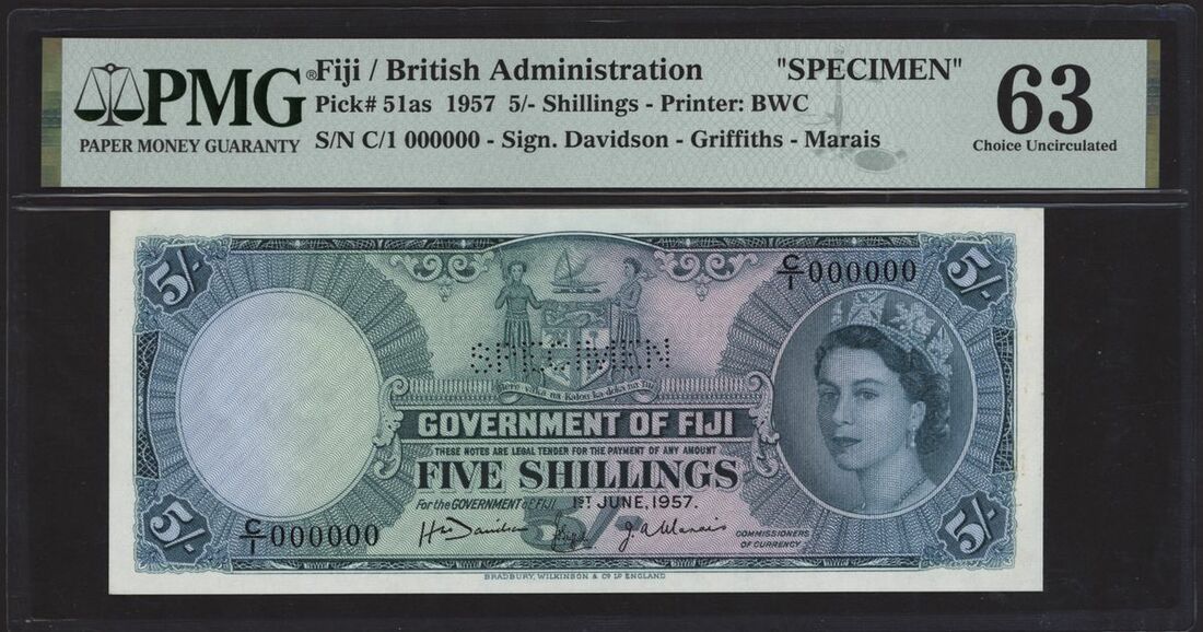 (x) Government of Fiji, specimen 5 shillings, 1st June 1957, serial number C/1 000000, (Pick 51as, BNB 328s), in PMG holder 63 Choice Uncirculated, previously mounted, only 1 note in a higher grade on PMG Census