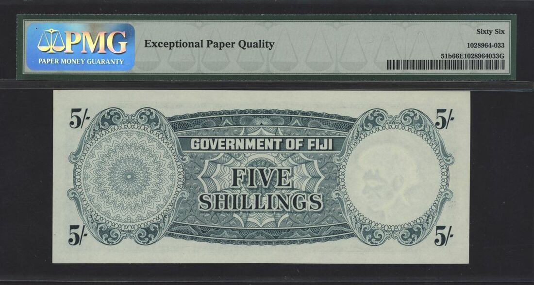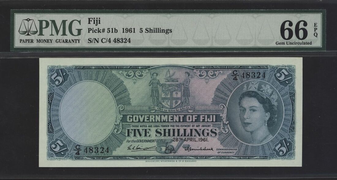 (x) Government of Fiji, 5 shillings, 28th April 1961, serial number C/4 48324, (Pick 51b, BNB 328), in PMG holder 66 EPQ Gem Uncirculated
