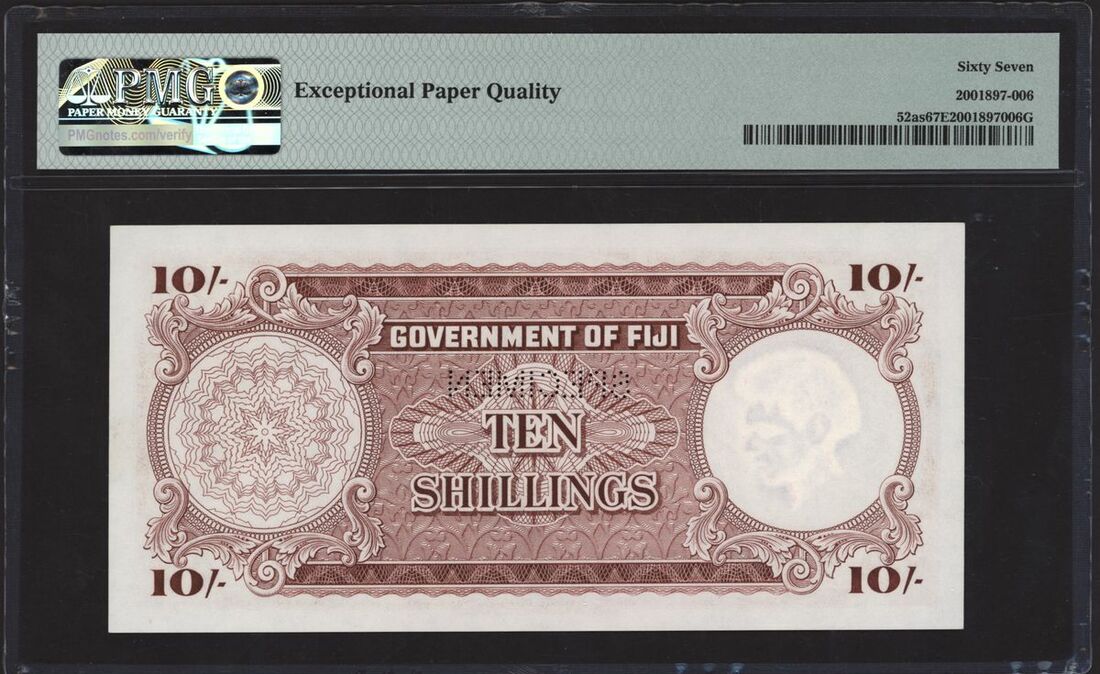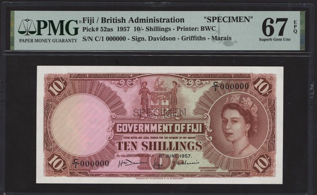 (x) Government of Fiji, [Top Pop] specimen 10 shillings, 1st June 1957, serial number C/1 000000, (Pick 52as, BNB 329s), in PMG holder 67 EPQ Superb Gem Uncirculated, scarce
