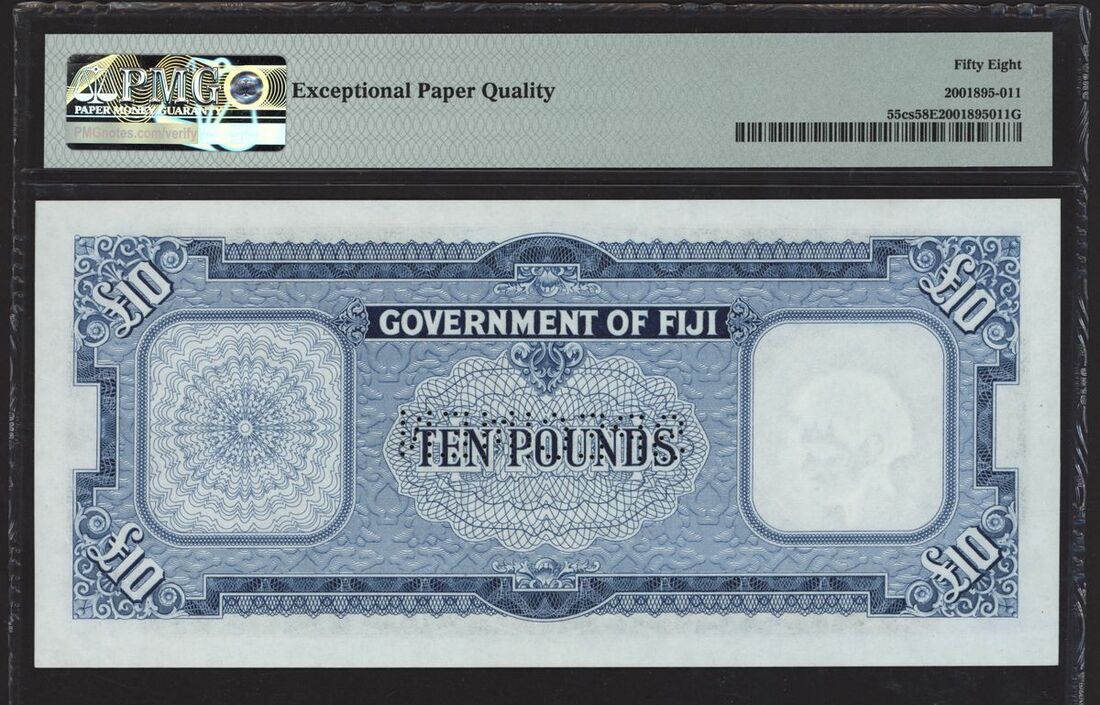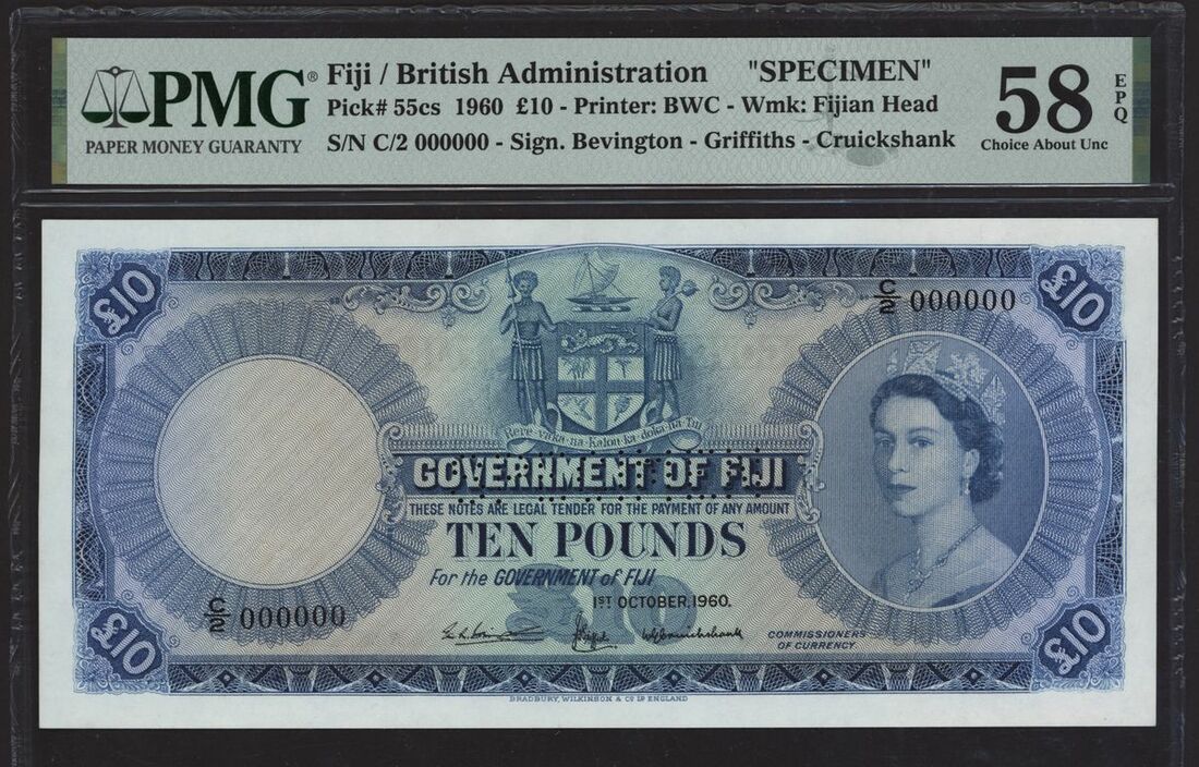 (x) Government of Fiji, specimen £10, 1st October 1960, serial number C/2 000000, (Pick 55cs, BNB 332s), in PMG holder 58 EPQ Choice Uncirculated, only 1 note in a higher grade on PMG Census, however this is the only note with EPQ, scarce