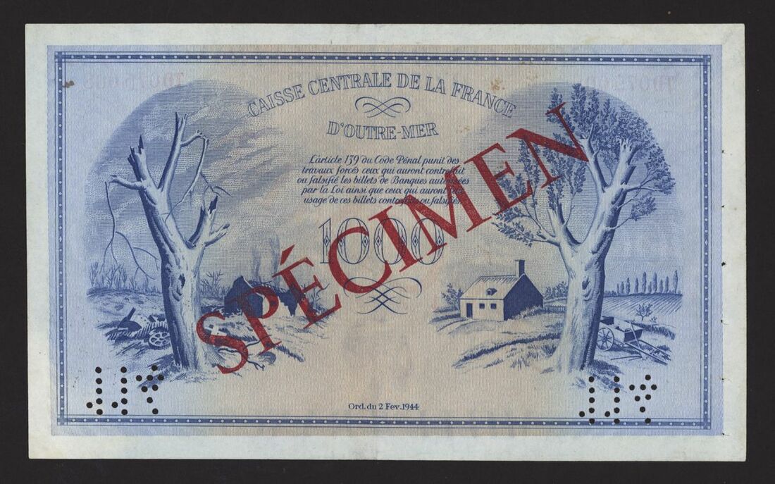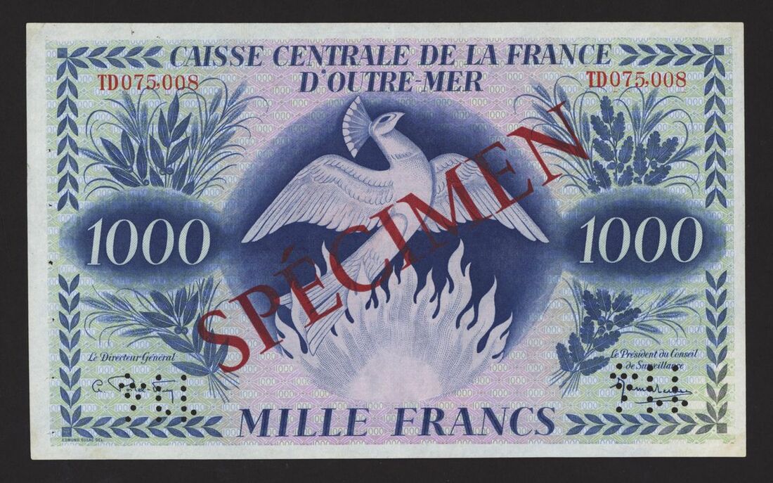 (x) Caisse Centrale de la France d'Outre-Mer, French Guiana, specimen 1000 francs, 1944, serial number TD075008, (Pick 18s, BNB 402s), extremely fine, perforations