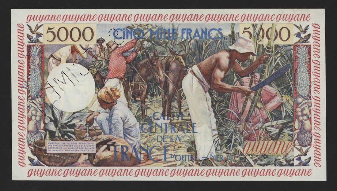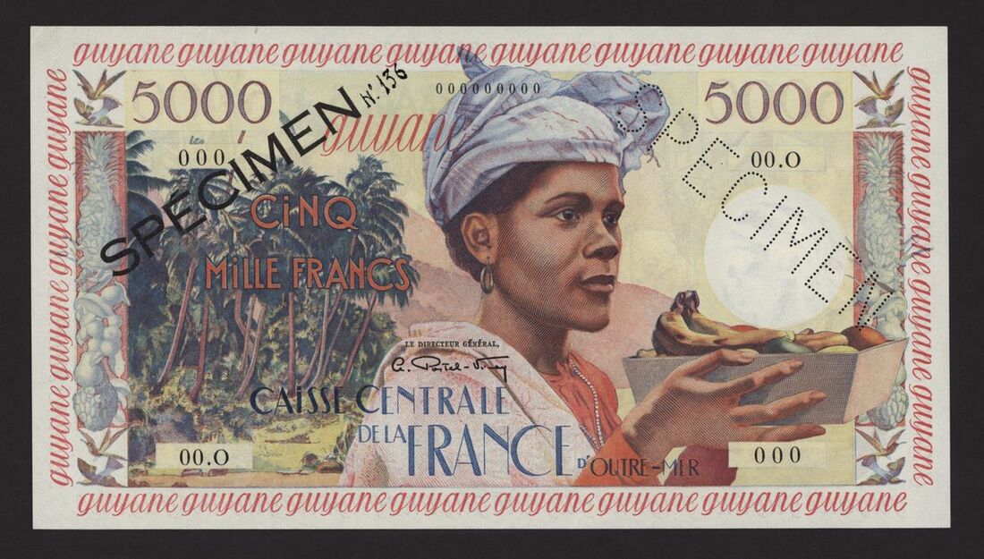 (x) Caisse Centrale de la France d'Outre-Mer, French Guiana, specimen 5000 francs, (ND 1960), serial number 00.O 000 136, (Pick 28s, BNB 412s), about uncirculated