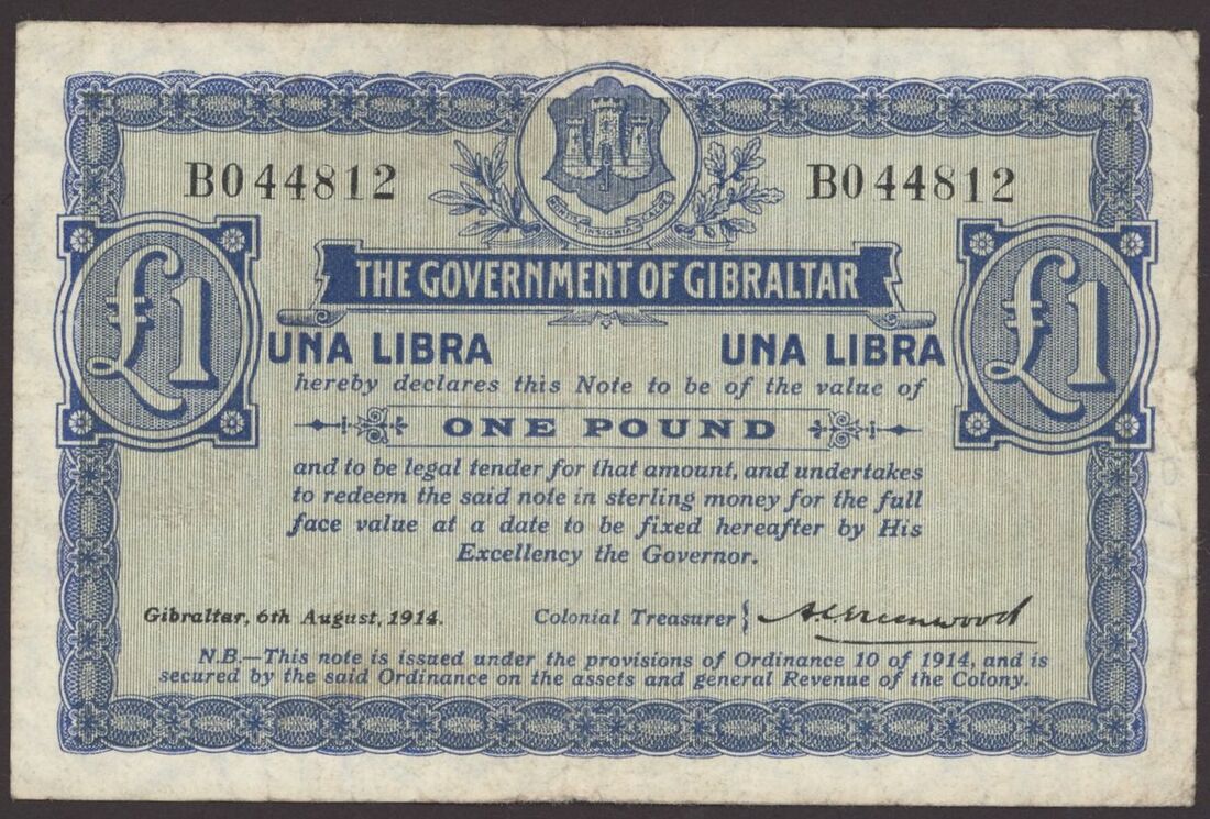 Government of Gibraltar, £1 = 1 Libra, 6th August 1914, serial number B044812, printed signature of the Colonial Treasurer Alfred Craven Greenwood