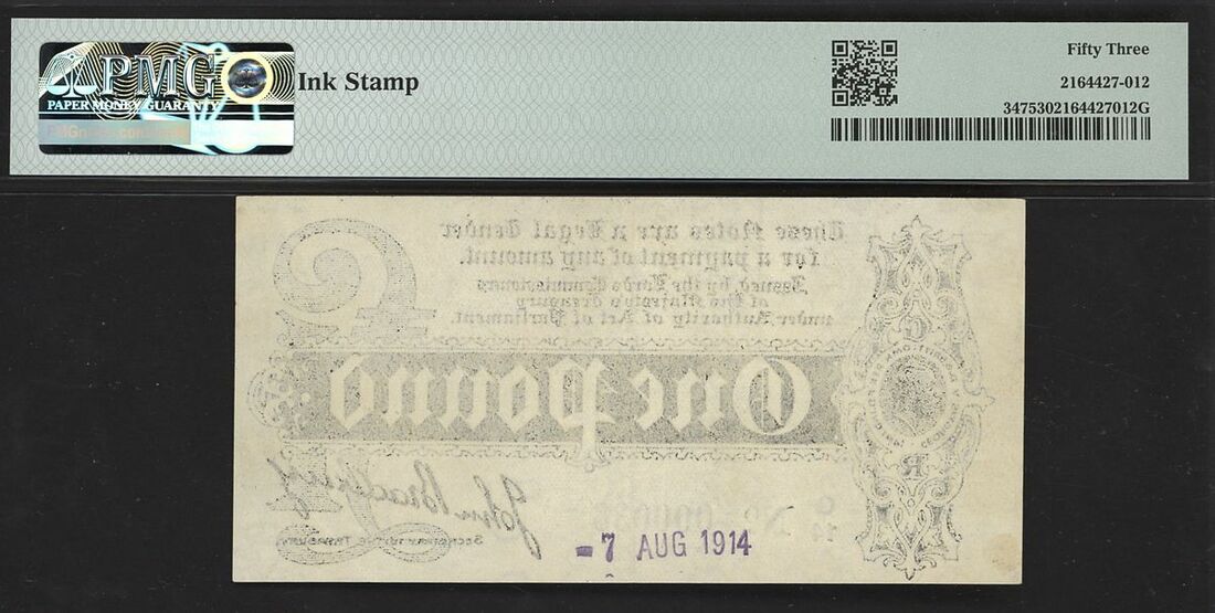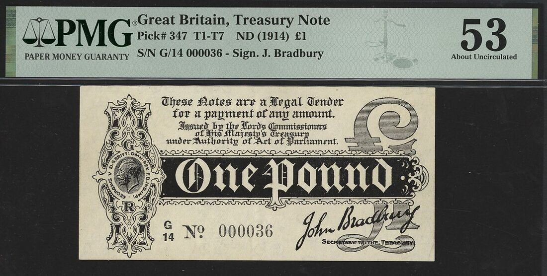 Treasury Series, John Bradbury, first issue £1, ND (1914), serial number G14 000036, (EPM T3.3, Pick 347), in PMG holder 53 About Uncirculated, very low serial number, scarce