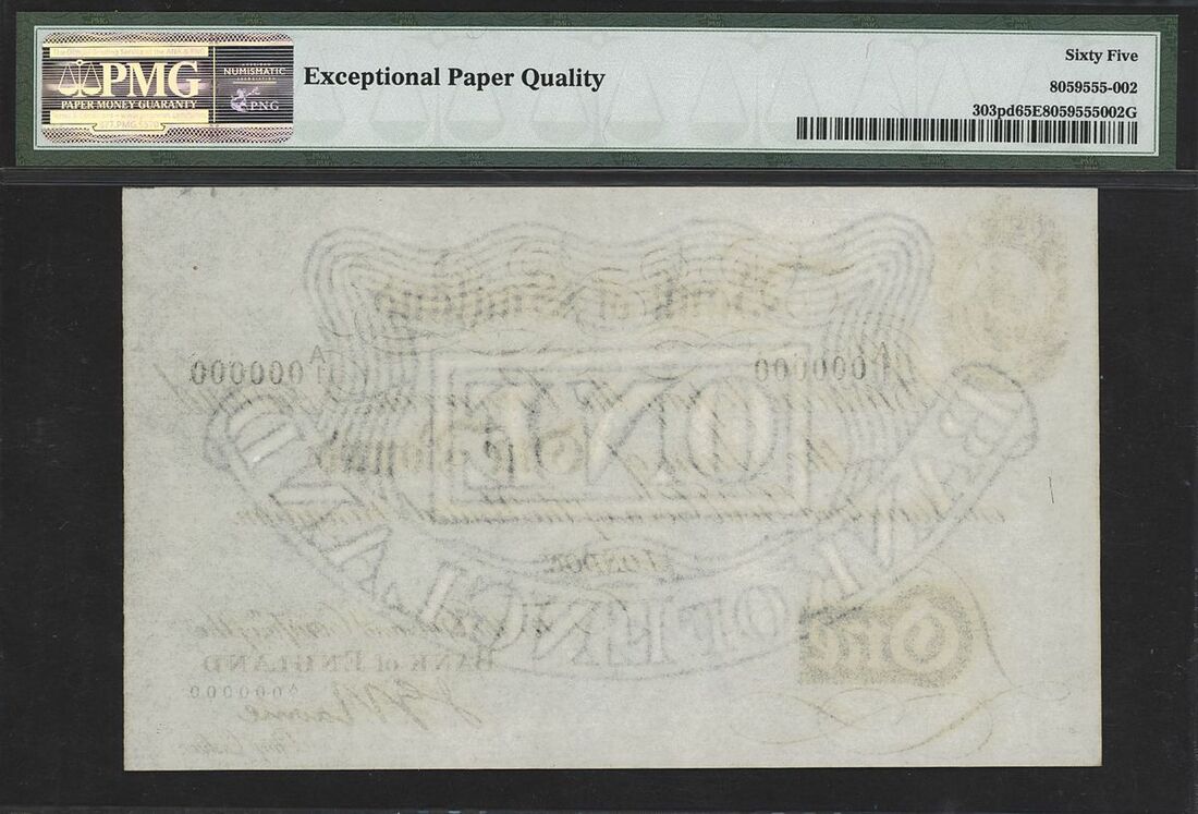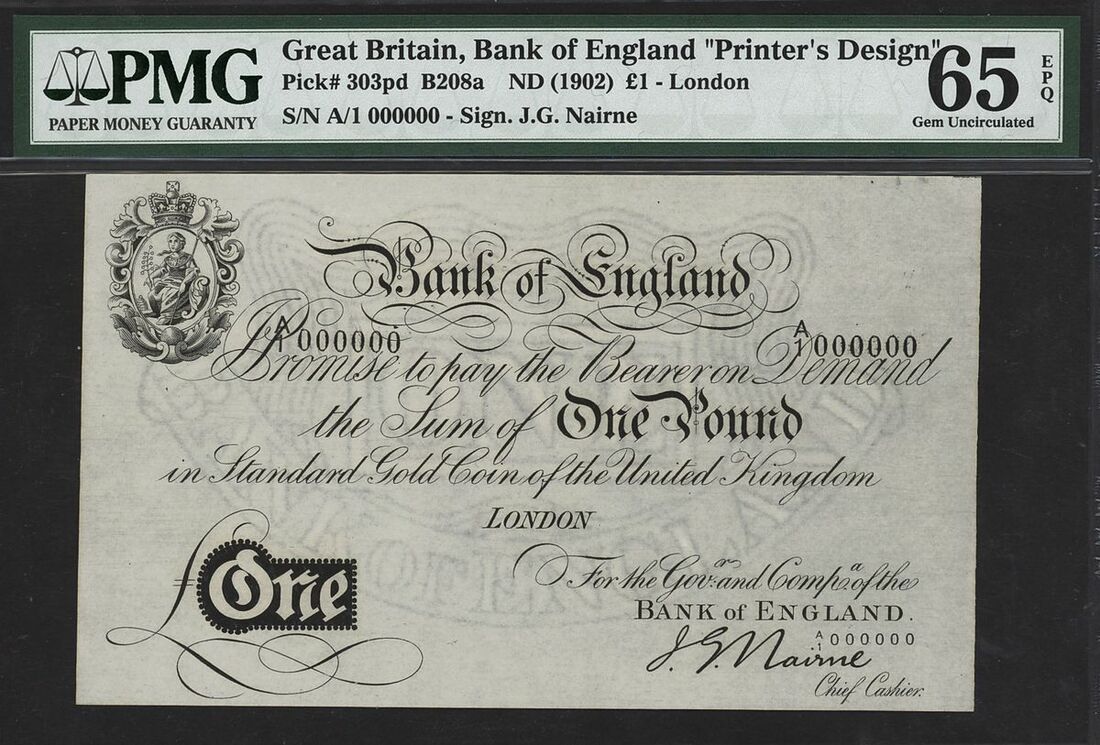 (x) Bank of England, J.G. Nairne, Printer's Design £1 'gold note', ND (1914), serial number A/1 000000, black and white, Britannia in ornate crowned vignette top left, value in black tablet low left,