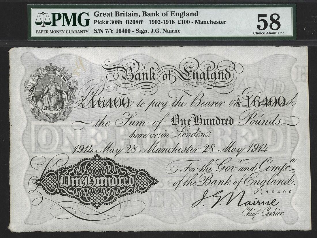 (x) Bank of England, J.G. Nairne, £100, Manchester, 28th May 1914, serial number 7/Y 16400 (EPM B208ff, Pick 308b), in PMG holder 58 Choice About Uncirculated. A lovely pre-war large denomination Bank of England note, scarce