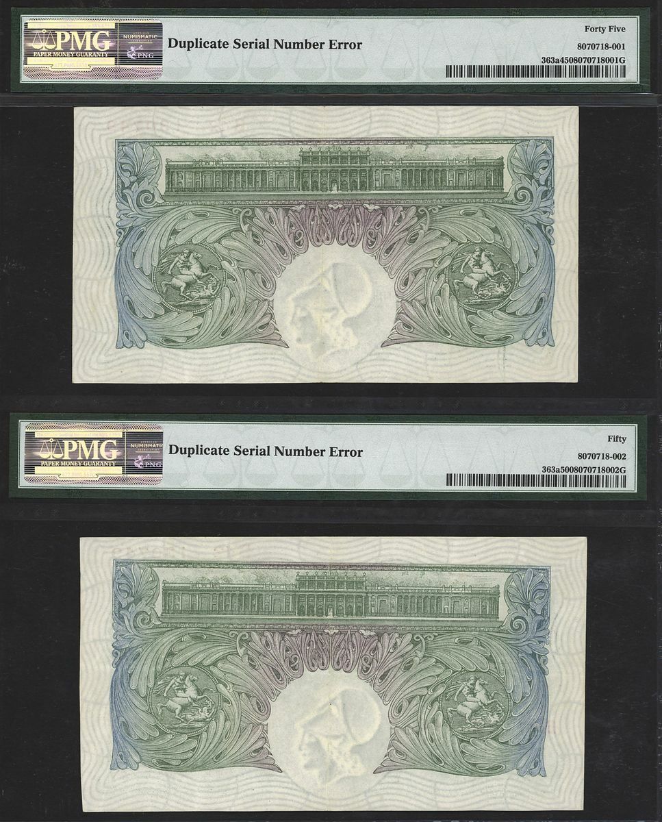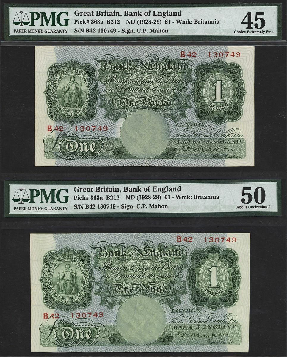 (x) Bank of England, C.P. Mahon, [Error, same SN pair] £1, ND (1928), serial number B42 130749/B42 130749, (EPM B212), in PMG holder, 50 About Uncirculated, 45 Choice Extremely Fine, scarce, duplicate serial number error (2 notes)